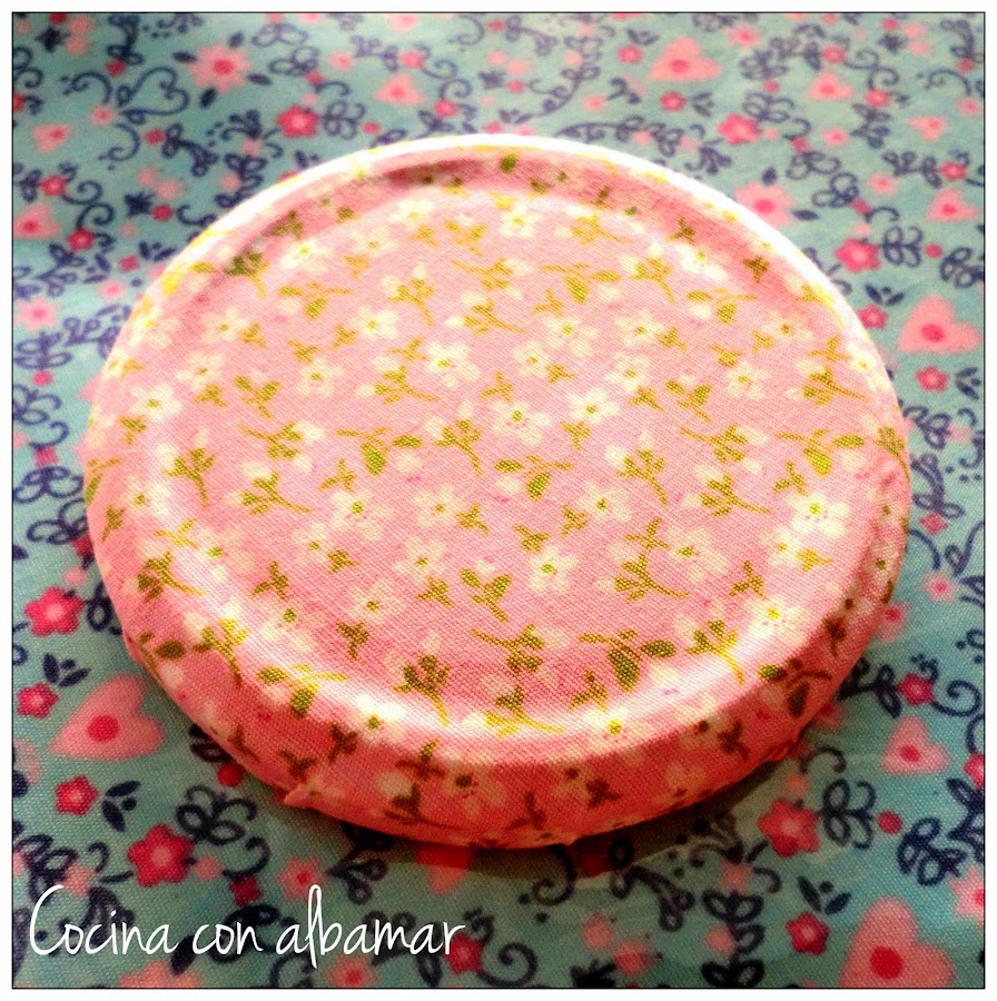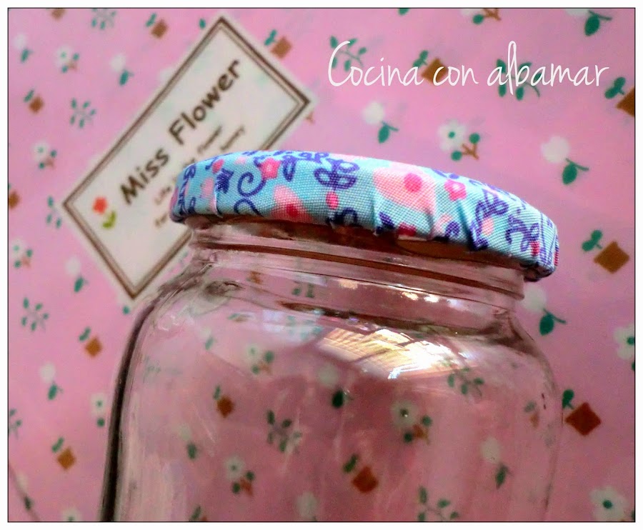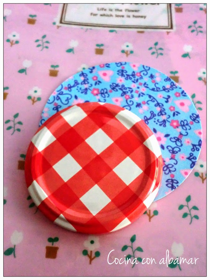 En este caso la manualidad es tan fácil como coger la tela y recortar la medida para tapar las tapas de los tarros.