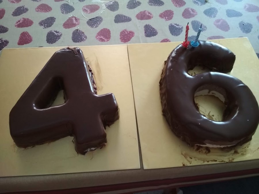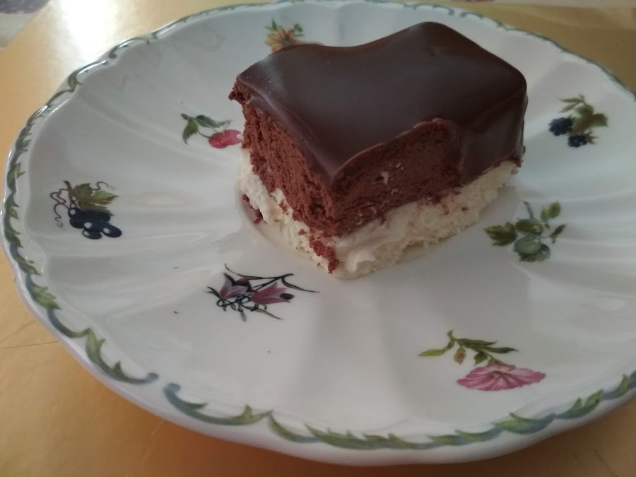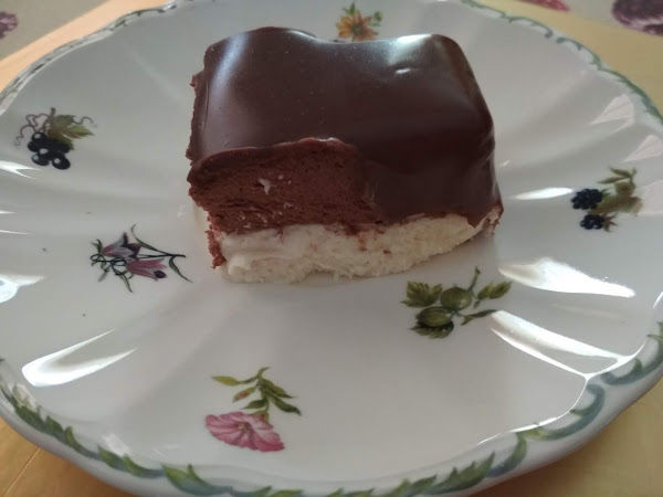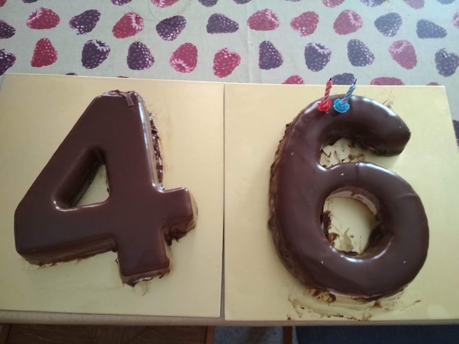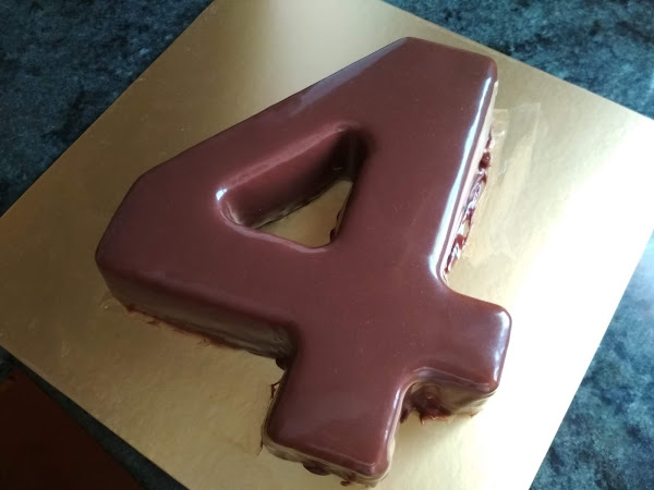 Preparé una mousse de chocolate negro y llené los moldes hasta la mitad, los dejé en el congelador. Al día siguiente preparé la de chocolate blanco y la puse encima, volvieron al congelador. El día de su cumpleaños hice un glaseado de chocolate con leche, desmoldé los números y los glaseé y quedó una tarta preciosa y riquísima.