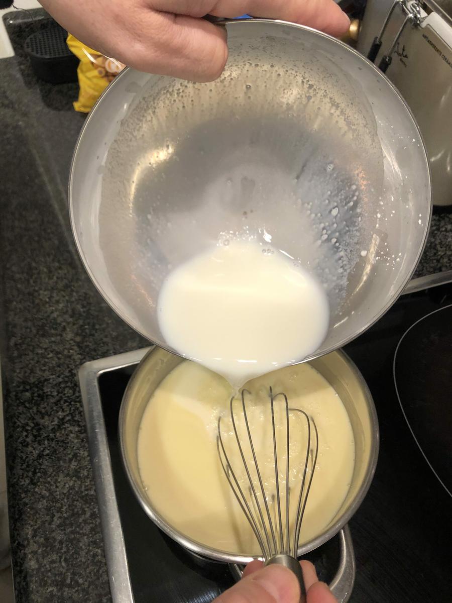 Ponemos el cazo a fuego medio y cuando este disuelto el chocolate blanco en la nata (crema de leche), añadimos la mezcla de leche y cuajada.