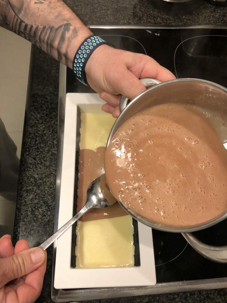 1Vamos a preparar la primera capa, en mi caso preferí poner la capa de chocolate blanco en la parte superior, si os gusta al revés cambiar el orden.