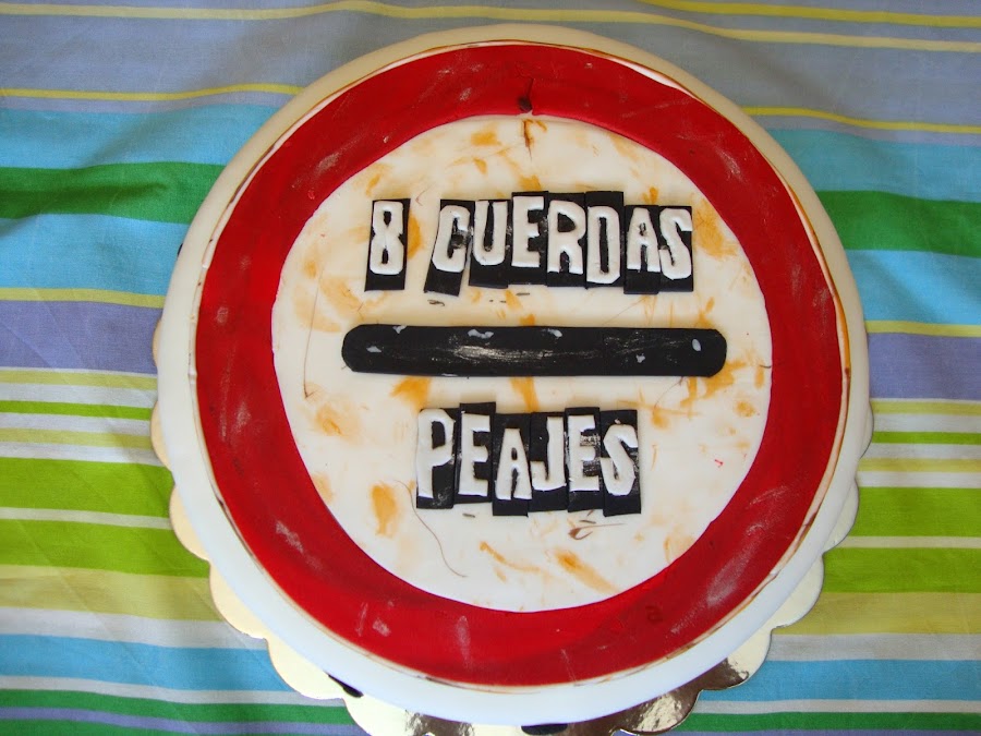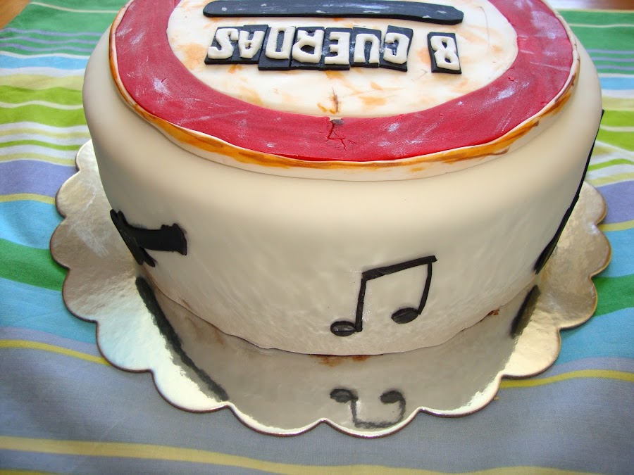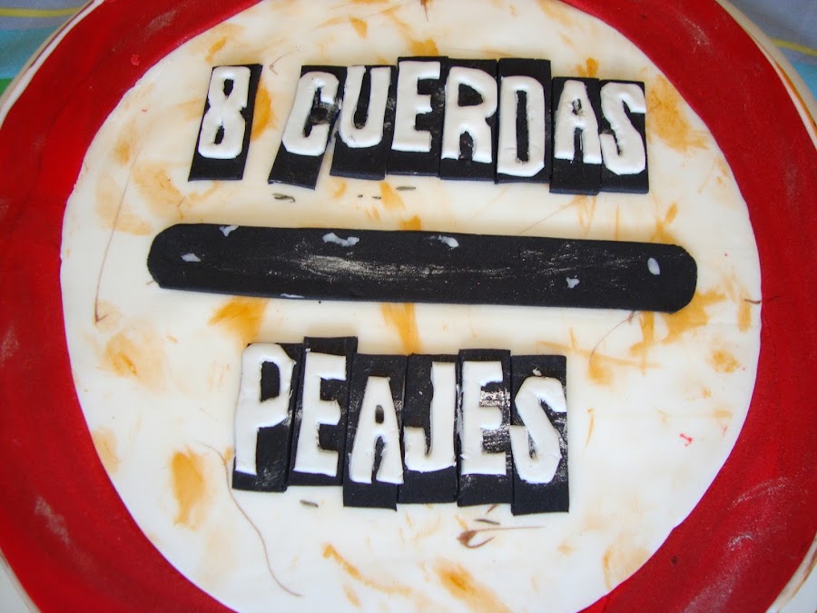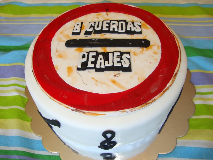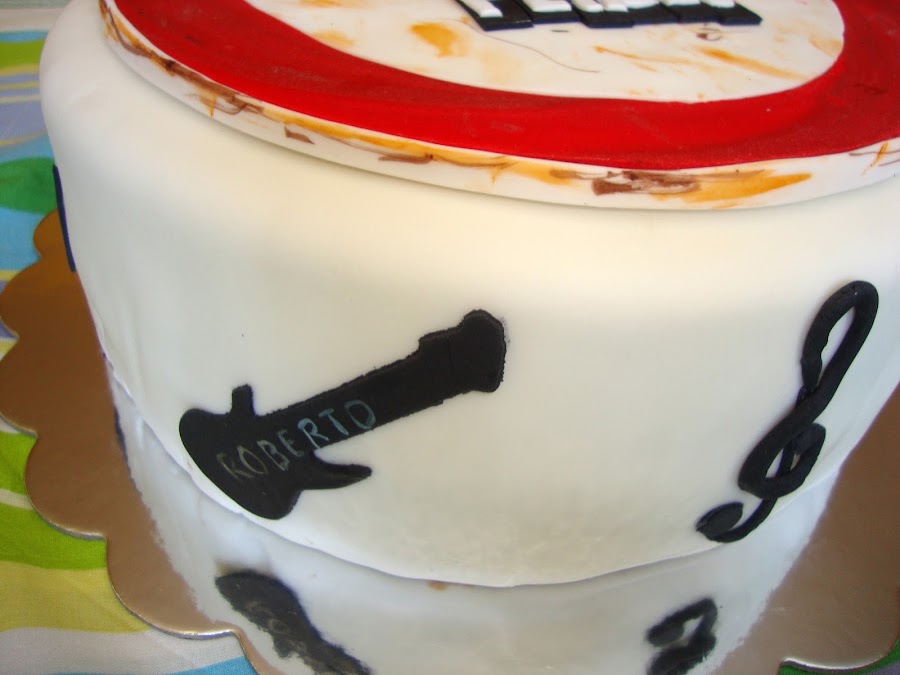 Alrededor de la tarta están en unas guitarras eléctricas los nombres de los componentes (Roberto, Alberto, Tony y Jorge) y unas notas musicales.