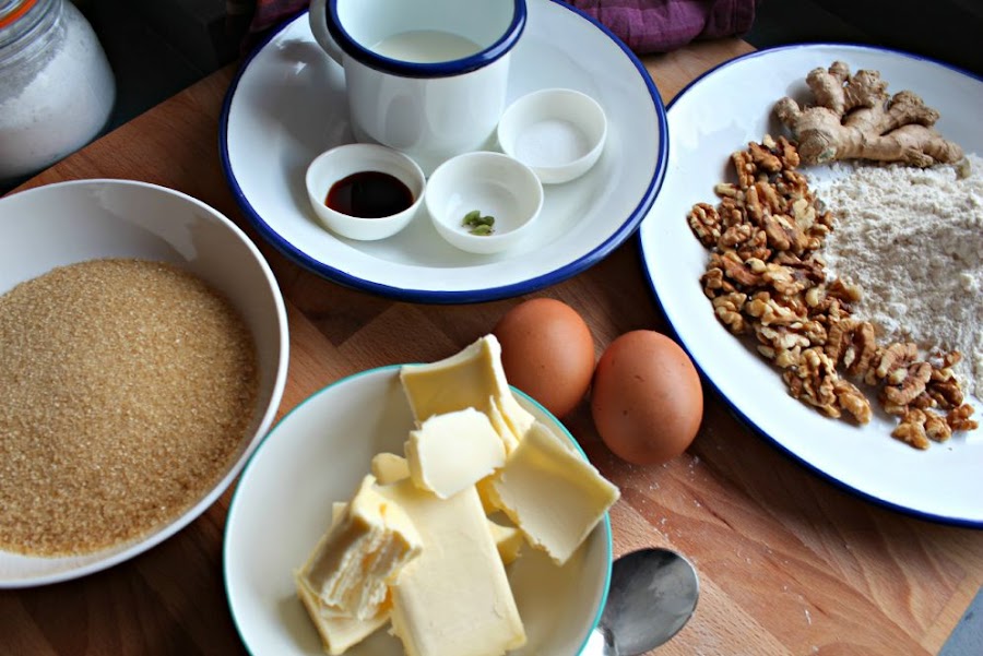 Picamos las nueces hasta reducirlas a "polvo" y las añadimos a la harina de repostería, el bicarbonato y las semillas de las vainas de cardamomo, machacadas. Mezclamos bien.