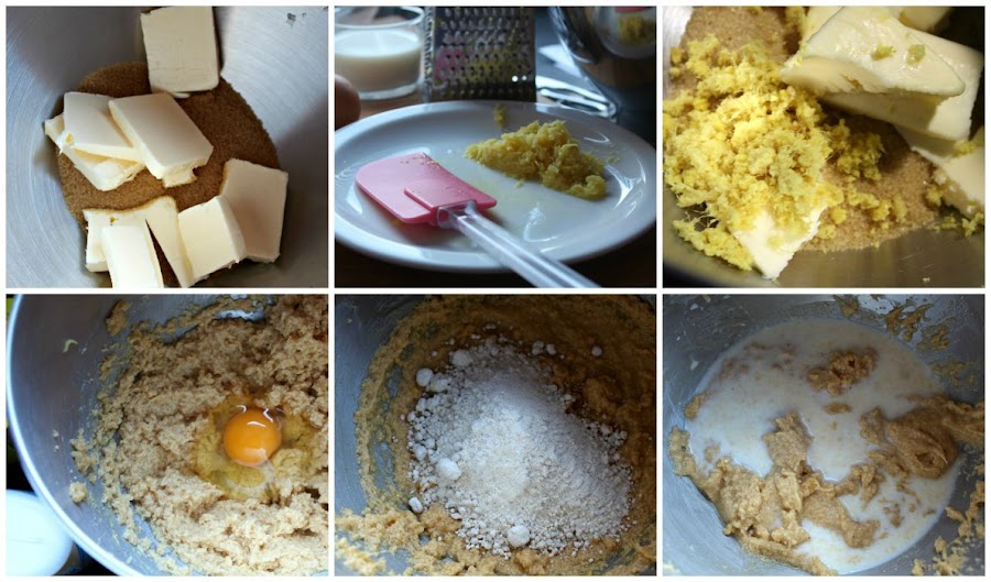 En un bol, grande, batimos la mantequilla, con el azúcar y el jengibre (pelado y rallado), durante 2-3 minutos hasta que la mezcla esté suave y esponjosa.