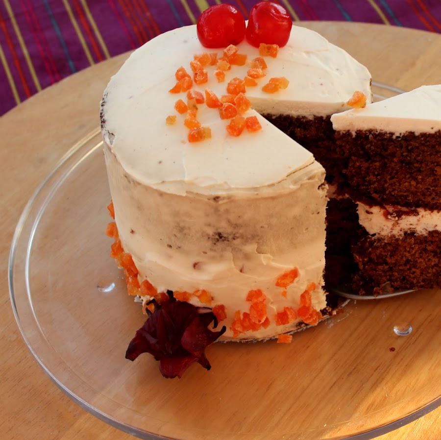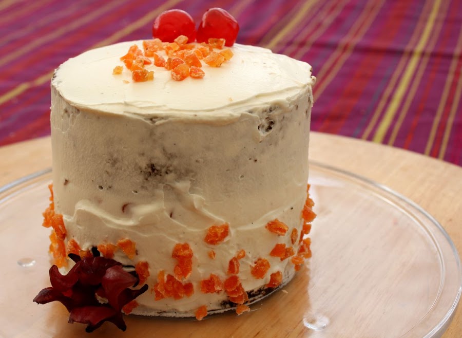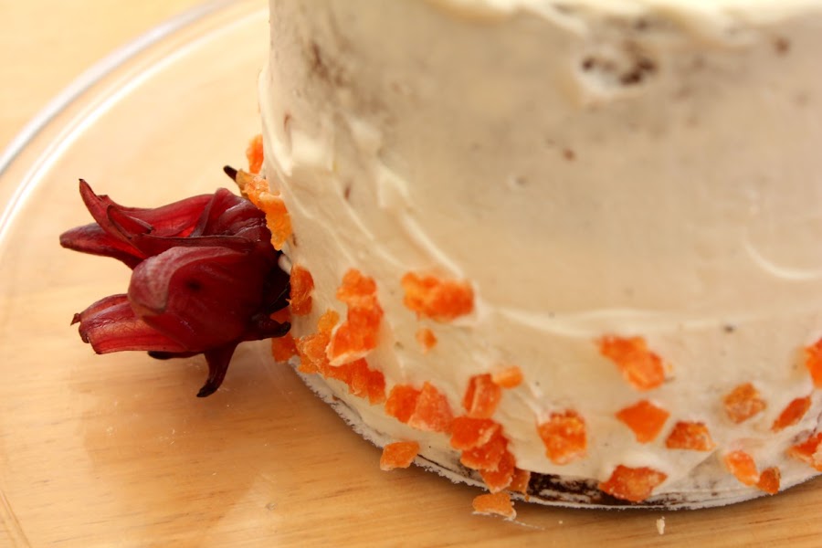 Cubrimos toda la tarta con la crema y decoramos con las Kumquat troceadas y la flor de hibisco.