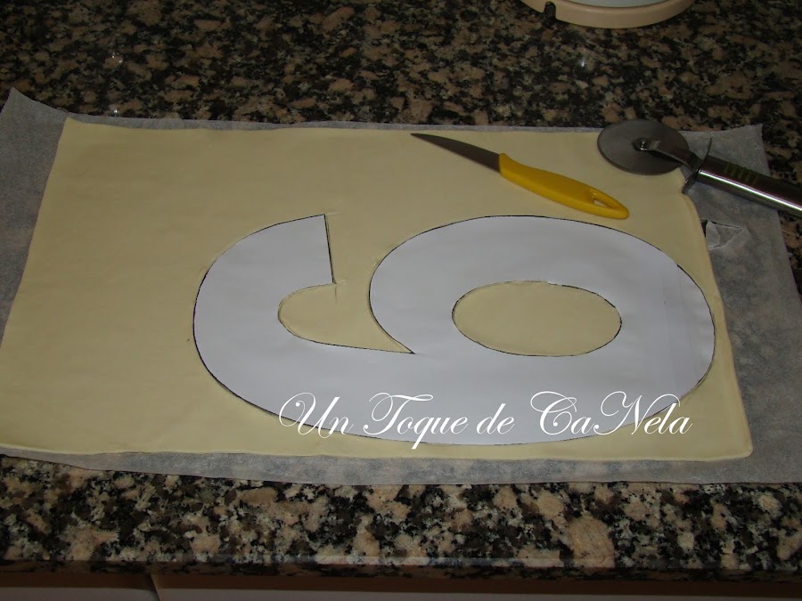 Pasar el rodillo por las láminas de hojaldre y colocar la plantilla del número y recortar.