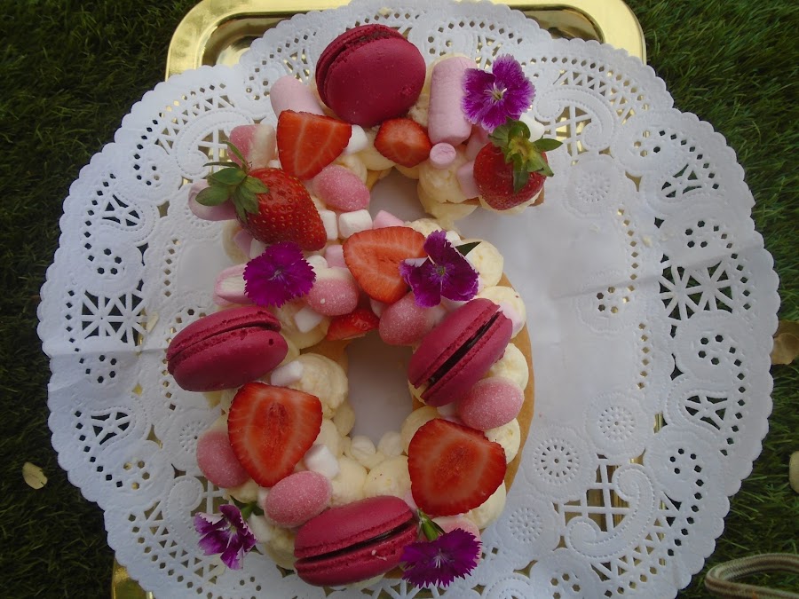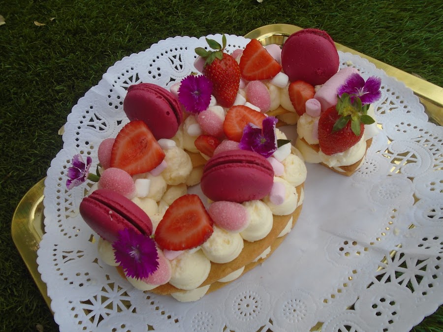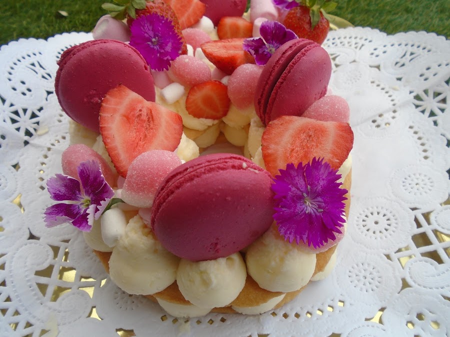 Podemos resumir que este pastel se trata de un sandwich de pasta sablée, relleno de crema diplomática, y cubierto de crema diplomática decorada con frutas, flores, merengues y macarons.