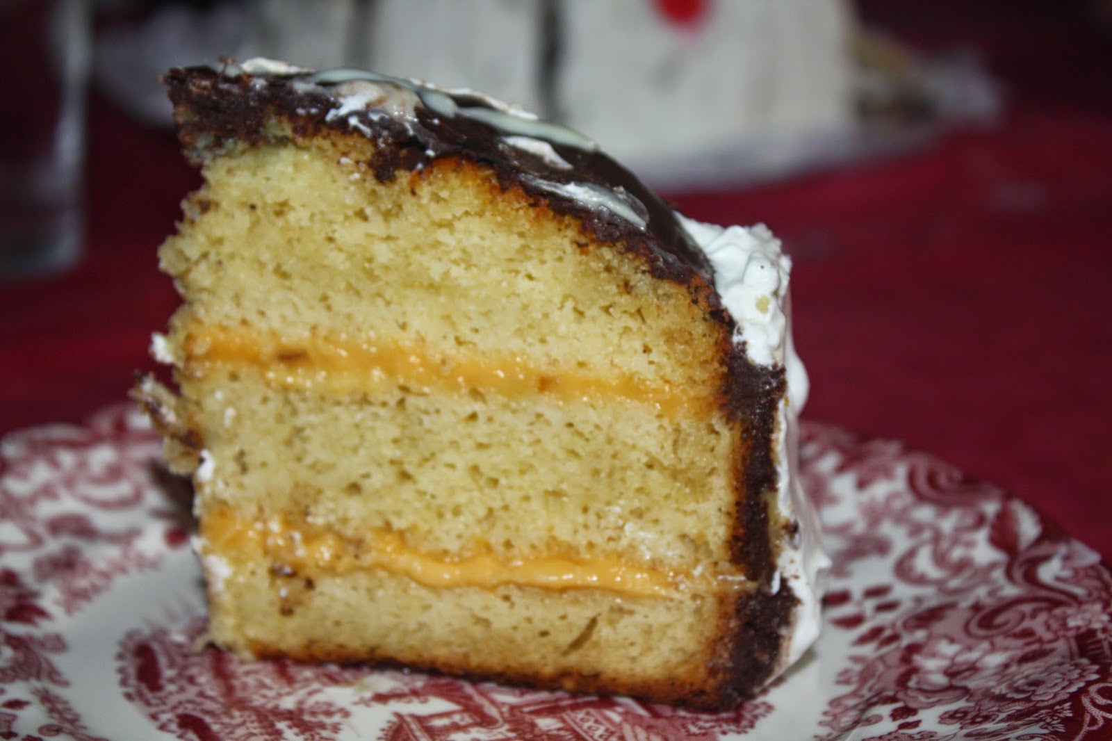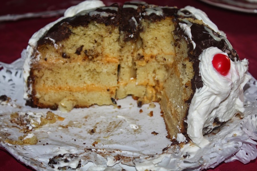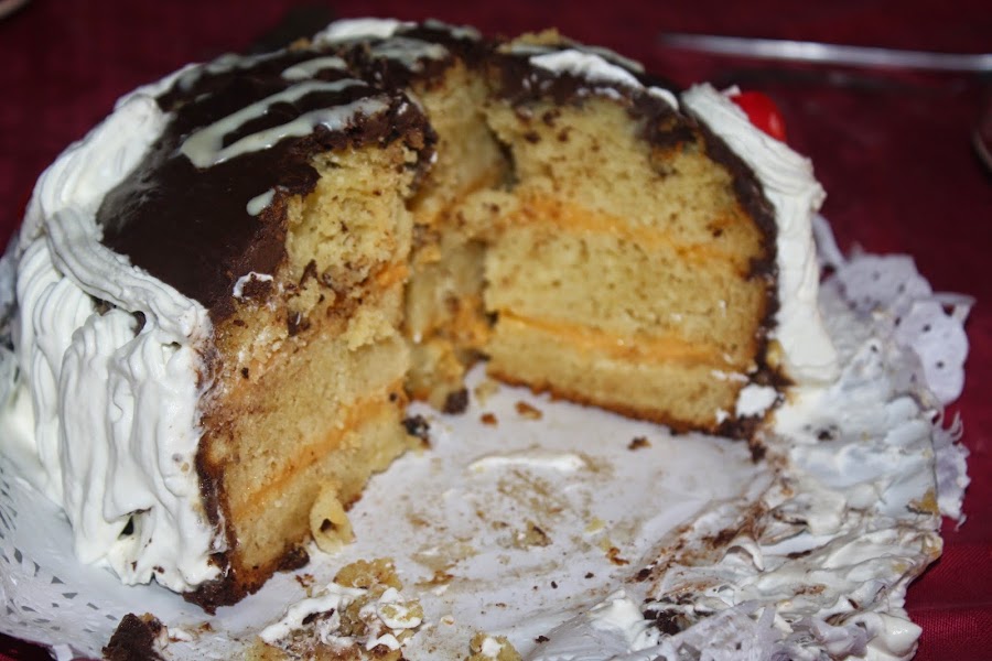 Un rico bizcocho relleno de pudding de caramelo, con cobertura de chocolate y decorado con natas... es irresistible, seguro que os gustará.