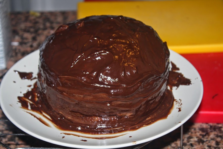 Lo ideal sería colocar la tarta sobre una rejilla y dejar que el chocolate caer, como no tenía rejilla para poderlo hacer así, pinté la tarta con chocolate, una vez sólido el chocolate pase la tarta al plato donde la presentaría.