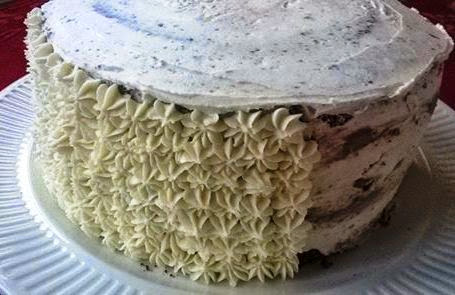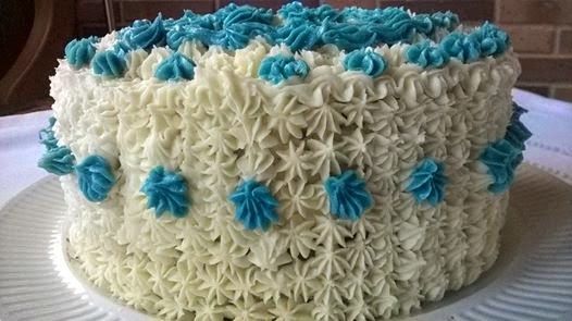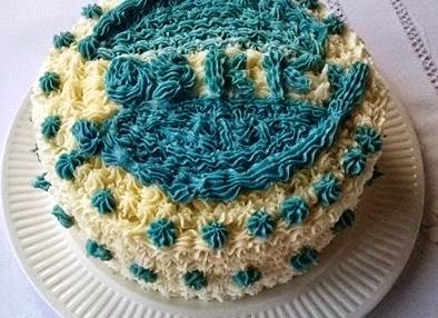 Luego, si quieres decorar con manga pastelera, yo lo hice con la boquilla Nro. 18, como en la foto. No me quedó muy bien porque tengo un dolor en la muñeca derecha que me ha hecho el trabajo bastante difícil.