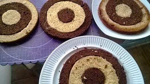 2º Con cortadores redondos cortar cada bizcocho en 3 aros o coronas, cuidando que queden concéntricos para que el aro del bizcocho sea igual de ancho por todos lados.