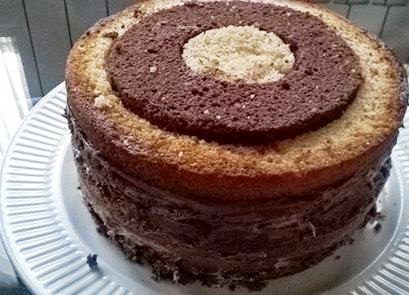 Es una tarta grande, hecha con molde de 21cm de diámetro. Hice 2 bizcochos (uno de chocolate y otro de vainilla) y cada uno lo corté en 2.