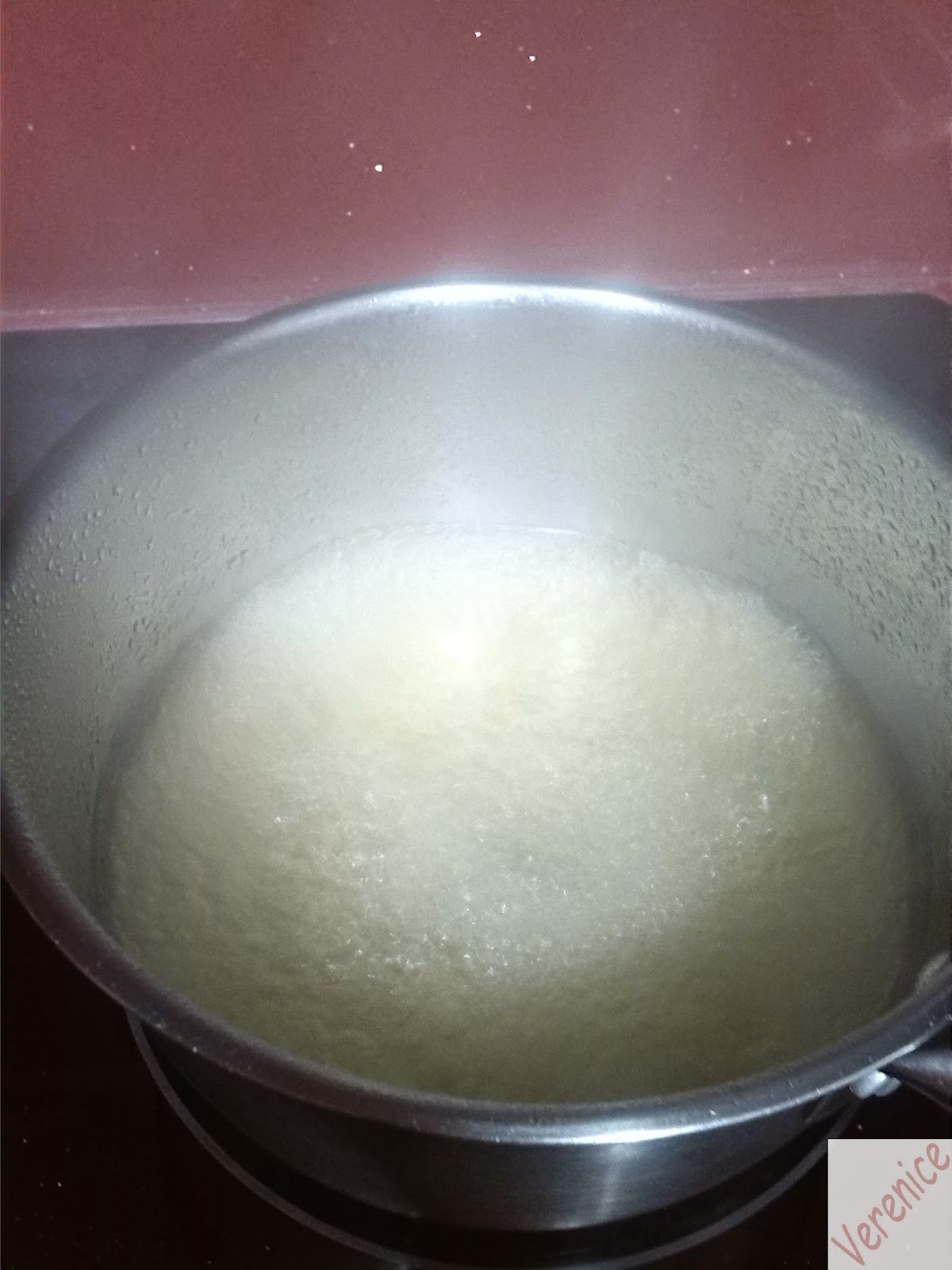 En un cazo al fuego se pone el azúcar con el agua hasta conseguir un punto almíbar líquido, unos 10 minutos