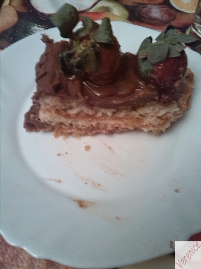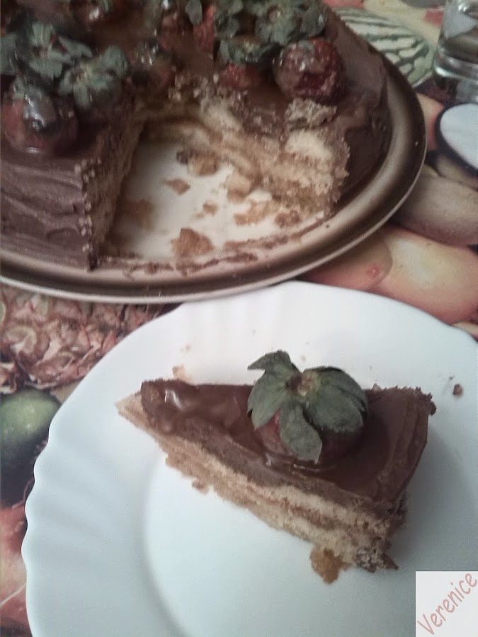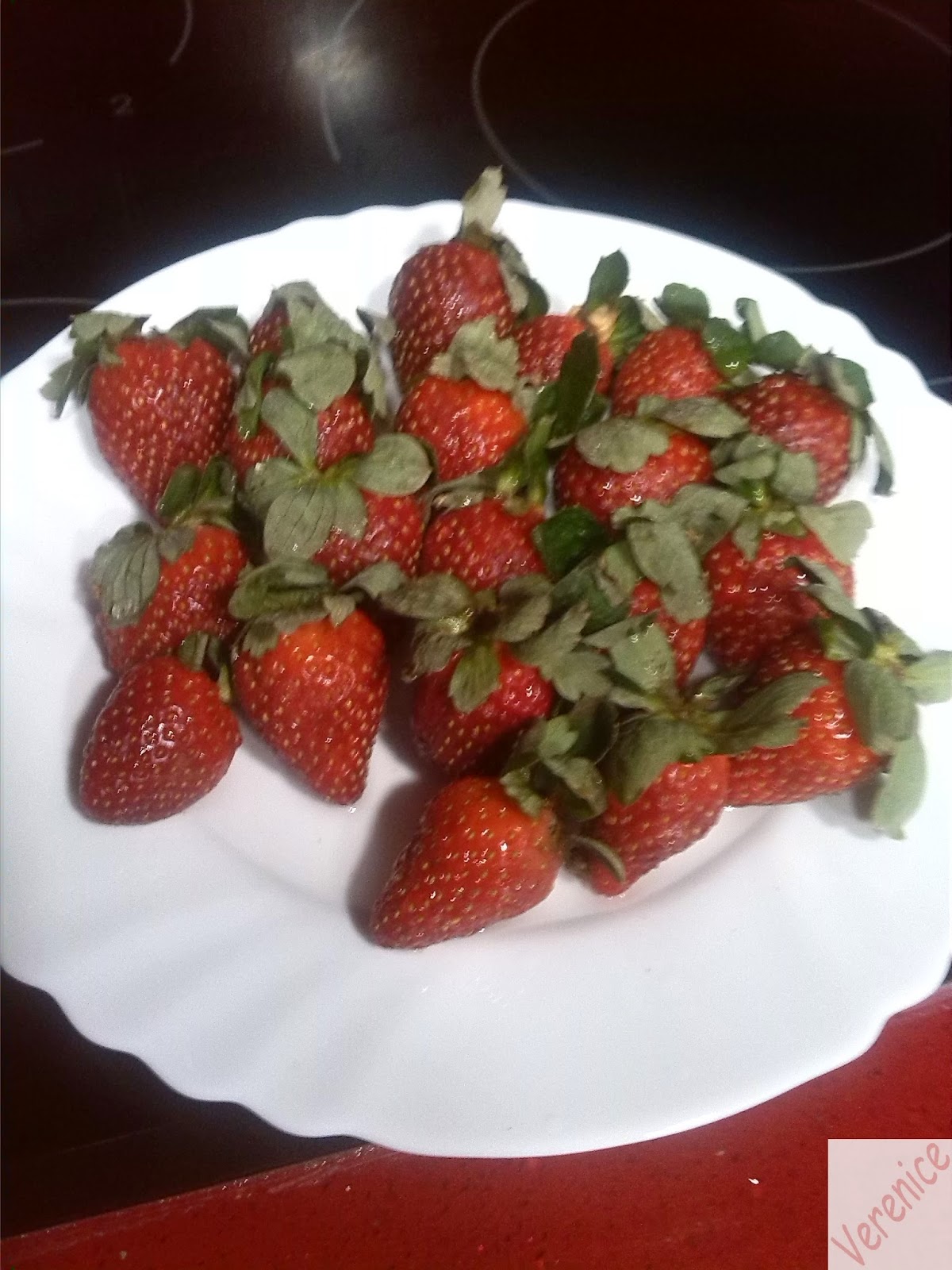 Dejamos enfriar 5 minutos y cogemos fresa por fresa, del rabito, y la bañamos en el toffe, colocándola sobre la tarta