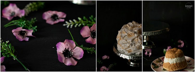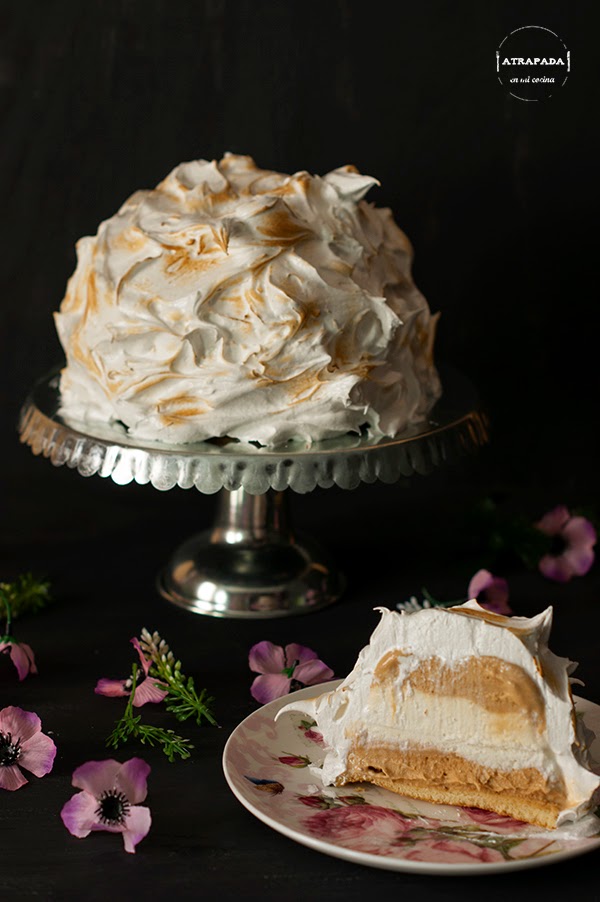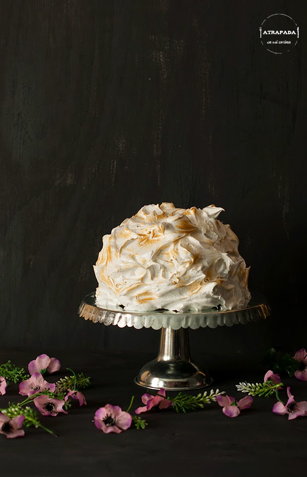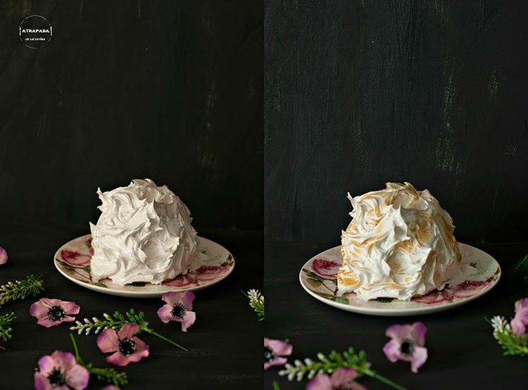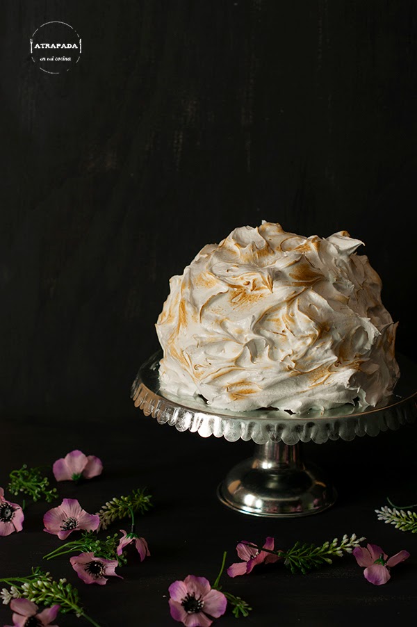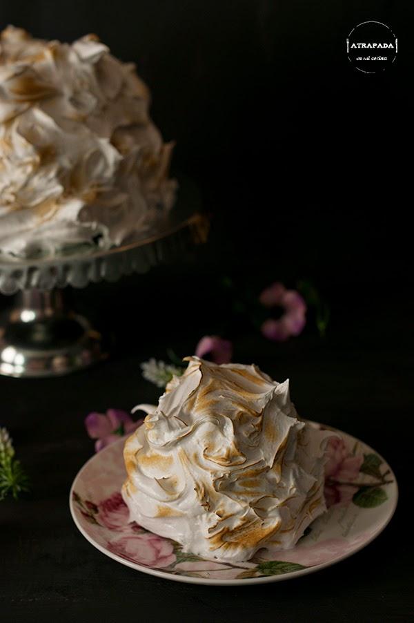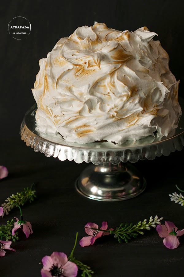 El día que la vayamos a tomar es cuando hacemos el merengue. He seguido la misma receta que os puse el año pasado en la tarta de yema tostada y merengue de la que os he dejado el enlace arriba. Es una receta infalible, necesitamos un termómetro para controlar la temperatura del almíbar y una amasadora con varias velocidades. Se trata del merengue italiano, si no tenéis termómetro tendréis que conseguir el punto de bola del almíbar, que podréis comprobar metiendo los dedos en agua y cogiendo con poco con los dedos y viendo que se hace una bola blanda. Otra de las claves para conseguir este merengue es las velocidades de la batidora. Si no tiene tantas velocidades vuestra amasadora tendréis que ir adaptando. Os lo pongo con las velocidades de la Kitchen Aid. Ponemos el agua y el azúcar el cazo al fuego, mezclamos y llevamos a ebullición. Ponemos las claras en el bol de la amasadora con el globo de batir, cuando la temperatura del almíbar llegue a 110º, ponemos en marcha la batidora con velocidad 8. Cuando la temperatura llegue a 119º, apartamos del fuego y vertemos en un chorrito fino sobre las claras con la máquina en velocidad 6. Cuando hayamos vertido todo el almíbar seguimos batiendo a velocidad 4 hasta que el bol esté completamente frío. Cuando ya casi esté, añadimos un poco de zumo de limón que hará que el merengue esté más blanco y brillante. Una vez frío podemos seguir batiendo a velocidad 2 hasta hasta que lo vayamos a utilizar para que no endurezca la cobertura. Una vez listo el merengue, desmoldamos la tarta, la ponemos en un plato de servir, y con la ayuda de una espátula vamos cubriendo totalmente tarta con el merengue, dejando picos para hacerla mas bonita. Una vez cubierta quemamos un poco el merengue con la ayuda del soplete, para darle un efecto más bonito. Servimos.