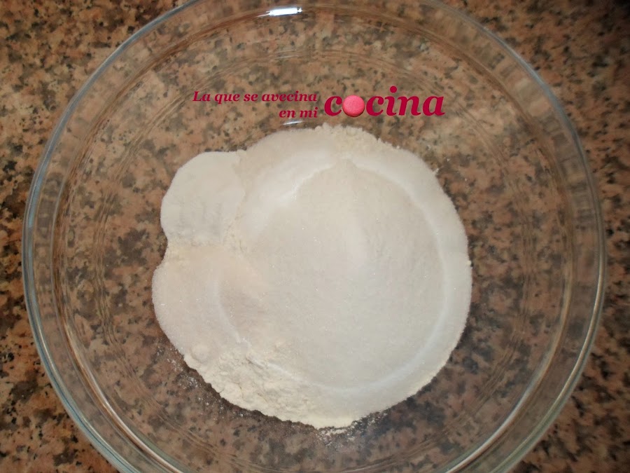 En un bol, harina, azúcar, azúcar avainillado y levadura.