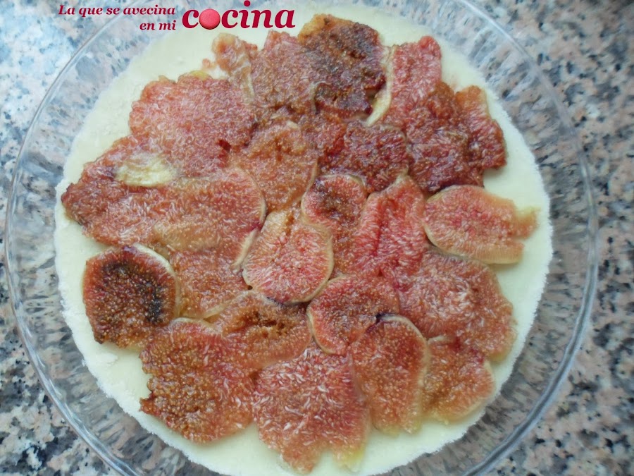 Es en ese momento es cuando pelaremos y partiremos por la mitad los higos (lo siento se me pasó echarle la foto). Una vez que los tengamos listos, los pondremos cubriendo la capa que hemos puesto como base. Cuando esté totalmente cubierta cogeremos una cuchara y los aplastaremos como si quisiéramos extenderlos. De esta manera conseguimos menos grosor en la capa de los higos y que además cubra mejor la tarta.