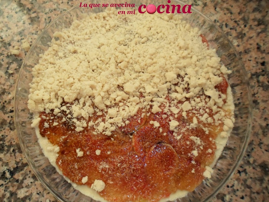 Ahora le cubriremos la tarta con las dos terceras partes de la masa que nos sobró anteriormente. Para ello la iremos espolvoreando con las manos pero haciendo en forma de grumos. Yo para asentarlos mejor, cuando la tenía totalmente cubierta los aplasté un poco con los dedos para asegurarme que "cerraba" bien la tarta :)