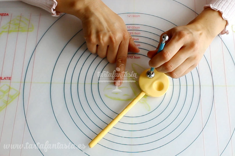 Forraremos un palito con fondant amarillo, de los que usamos para hacer galletas, piruletas, he usado uno de 20 cm de la marca Wilton.