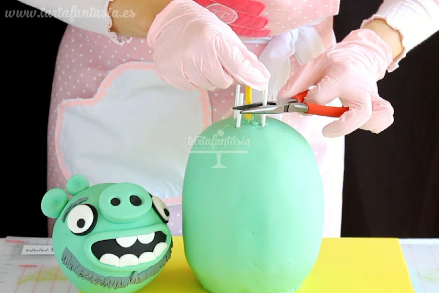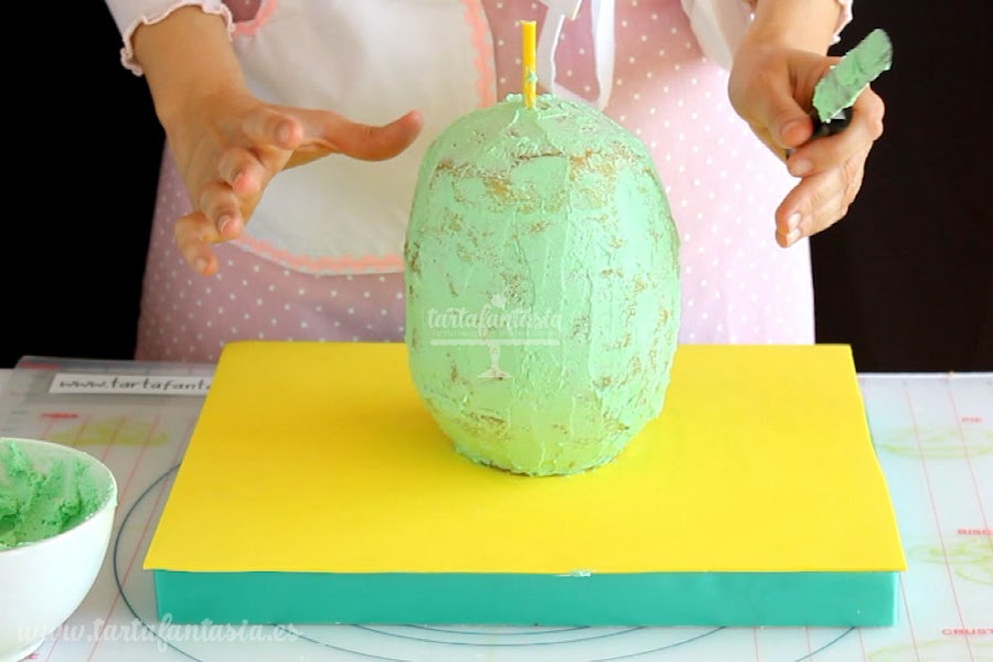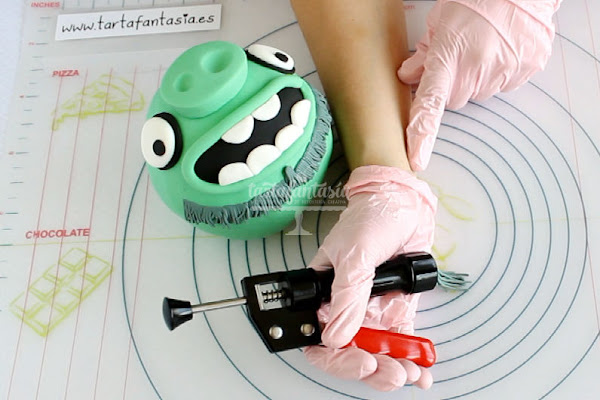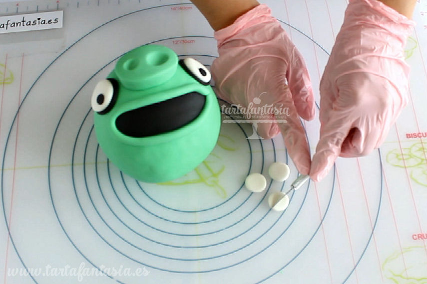 Trascurrido el tiempo de secado nuestra cabeza estará lista para decorar. Lo primero de todo es cubrirla con fondant verde, cortar los ojos y morro con cortantes circulares de galletas.