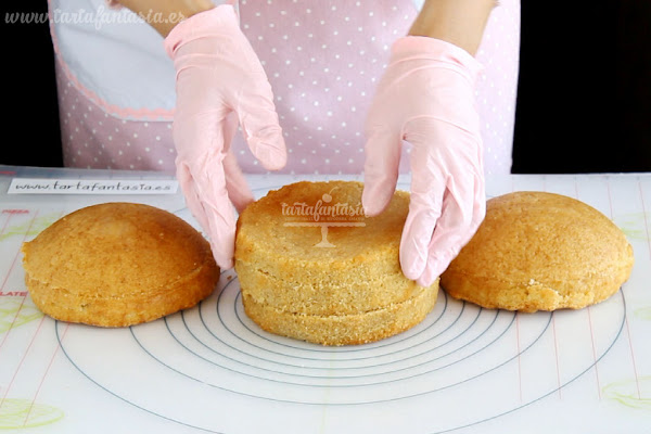 Ha llegado el momento de montar la tarta con el bizcocho especial para hacer tarta esculpidas o tartas en 3D. Estoy realmente feliz con este bizcocho, se desmiga muy poco por lo que se puede esculpir muy bien con él y está riquísimo, muy sabroso, es más, apenas añadí almíbar a la tarta.