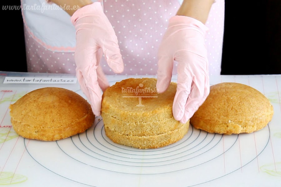 ♥ Tres bizcochos especiales para tartas esculpidas. Uno de 15 cm de diámetro y 10 cm de altura, y otros dos medias esferas, también de 15 cm de diámetro. Si no tenéis molde para hacer esferas podéis hornear dos bizcochos y 15 cm y 10 de altura, una vez montada la estructura podréis darle forma. La receta del bizcocho está en el blog ¡estoy muy feliz! es un bizcocho excelente no se desmiga casi nada, es sabroso y con muy buen sabor.