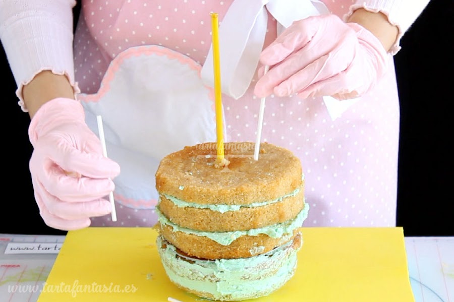 Lo más importante en esta tarta es hacer una buena estructura interna. Para hacerla he usado palitos y bandejas de diferentes tamaños, la tarta debe estar totalmente atravesada por una varilla central de madera, la que usé en esta tarta, es de la marca Wilton y la podéis comprar en tiendas de repostería creativa.