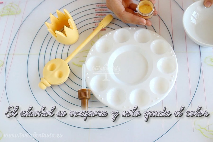 Para la corona y el cetro he usado fondant amarillo al que le ha añadido CMC, cada 100 gr de fondant una cucharadita rasa, de las más pequeñas que tenemos en casa de las de café o te. Amasamos y dejamos reposar una horas, de esta forma el fondant endurecerá más rápido durante el secado y además nos facilita trabajar con el fondant.