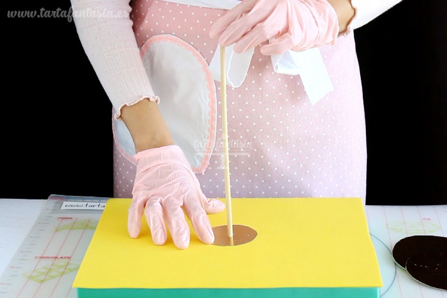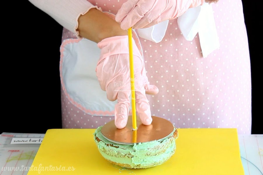 Tengo una forma bastante peculiar para hacer la estructuras de las tarta, se puede decir que "empiezo la casa por el tejado" porque lo primero que pongo sobre la bandeja de la tarta es la varilla de madera, que forro con una pajita, para que la madera no esté en contacto con la tarta. Esto lo puedo hacer porque la bandeja es de corcho blanco, poliespán y se puede atravesar fácilmente. Si vuestra bandeja es rígida, y no la podéis atravesar con la varilla, montaríamos el primero de los bizcochos y después lo atravesaríamos con la varilla central, y de esta forma continuaríamos añadiendo el resto de las tartas.