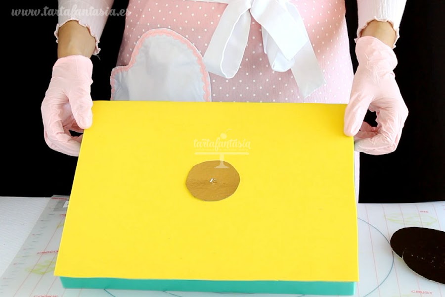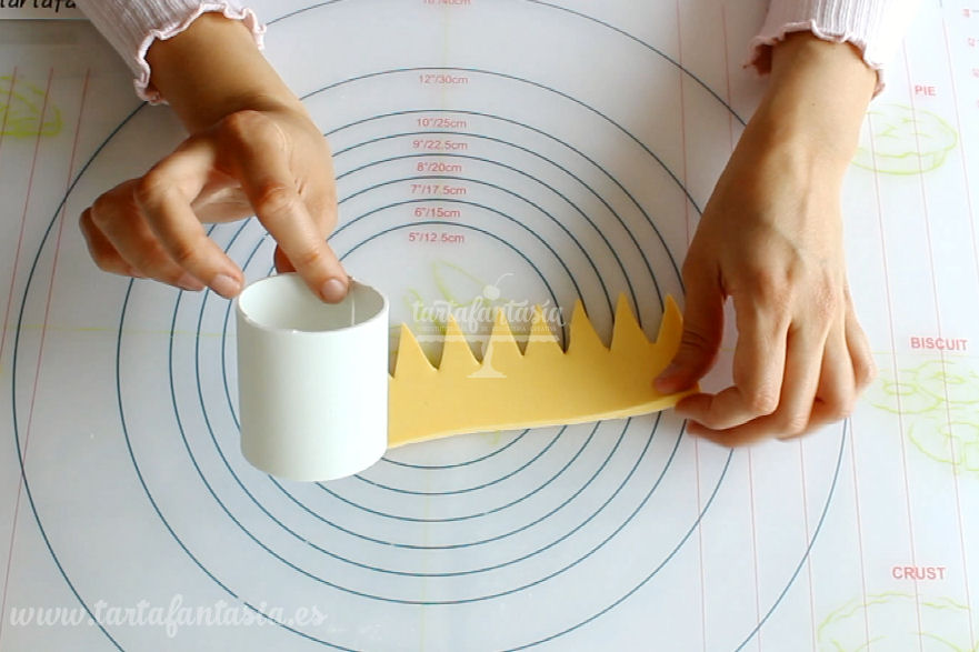 Con la corona cortaremos un rectángulo de fondant amarillo, he usado una regla de 15 cm para hacerlo. En el rectángulo que hagamos marcaremos la distancia por donde cortar la forma dentada de la corona. Una vez marcada cortaremos con un bisturí de cocina o cuchillo.