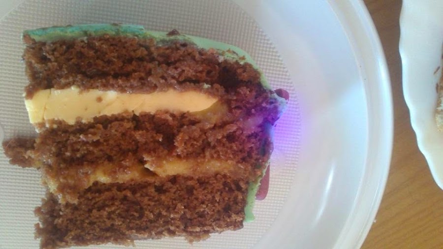 Bizcocho de chocolate relleno de crema y mousse de naranja.