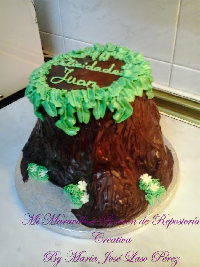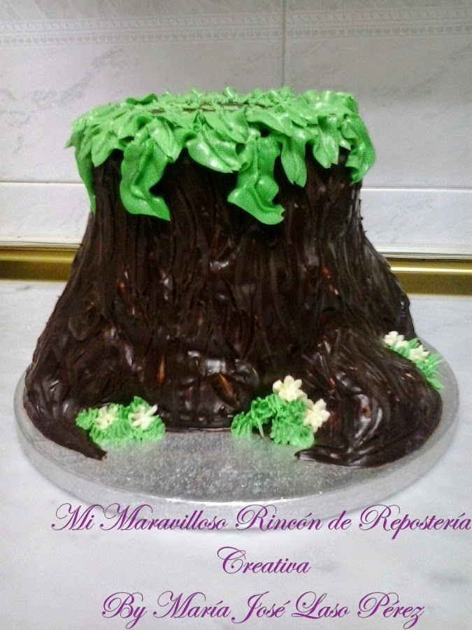 La decoración superior, en forma de hojas, estaba realizada con la boquilla nº 56 de Wilton, con una buttercream de mantequilla con sabor limón. Os pongo unas fotos para que podáis ver el trabajo de tallado del bizcocho y el esculpido para darle forma a las grietas del tronco. El hacer tartas diferentes, me llena de satisfacción, es un reto para mí, porque agudiza mi ingenio y como quiero que mis tartas sean originales (no me gustan las copias de otras tartas) despierta mi lado creativo.