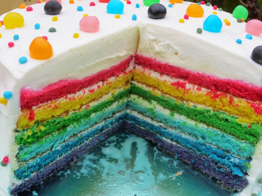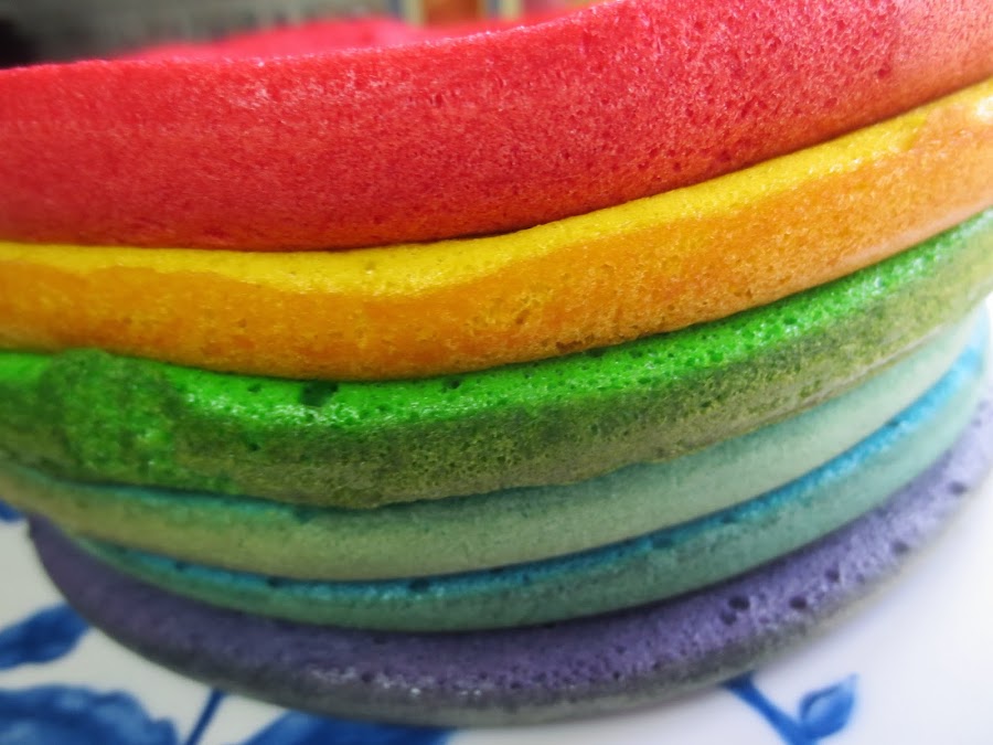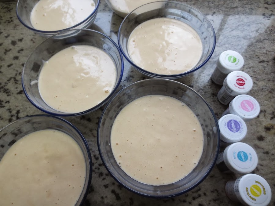 Dividir la masa en tantos colores como vayamos a teñir. Yo hice 6, como la masa me pesaba unos 640 gr., cada capa le puse 105 gr. Añadir los colorantes y mezclar bien.