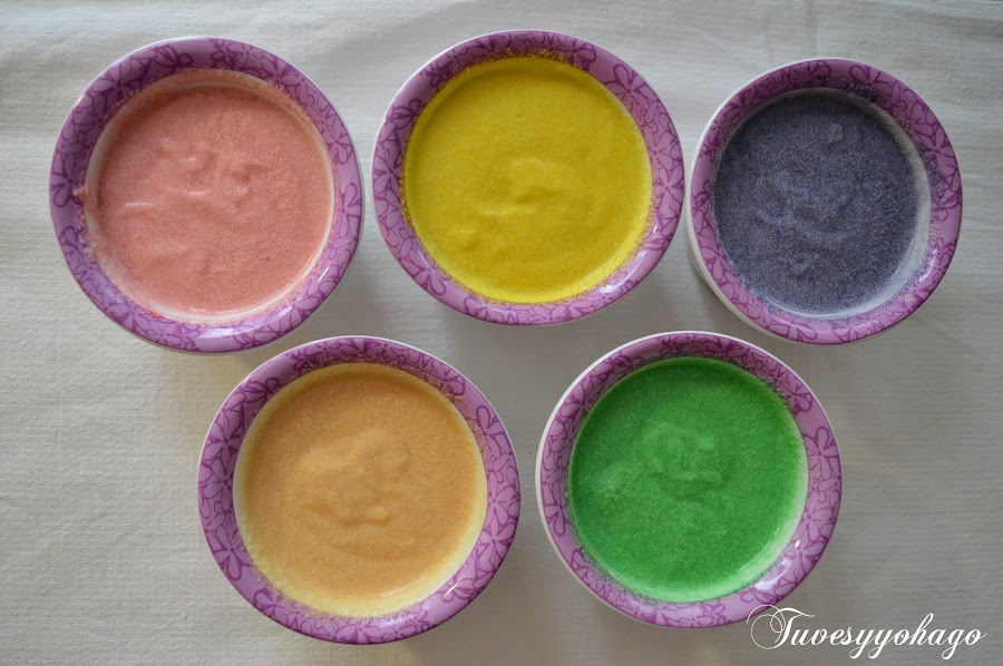7. Teñir cada cuenco de masa de un color: amarillo, rojo, naranja, verde y morado.
