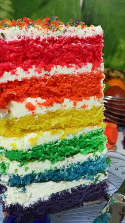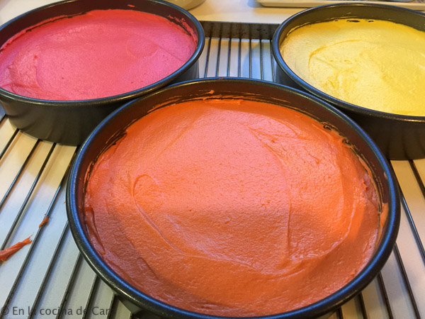 No es una tarta difícil de hacer, pero al tener varios colores tenemos que tener varios moldes u hornear en muchísimas tandas, por suerte a los dos los tengo :)