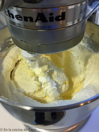 En la batidora, pondremos la mantequilla a temperatura ambiente junto con el azúcar y la haremos funcionar con la paleta por espacio de 5 o 6 minutos.