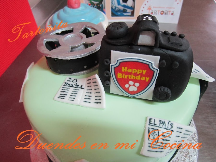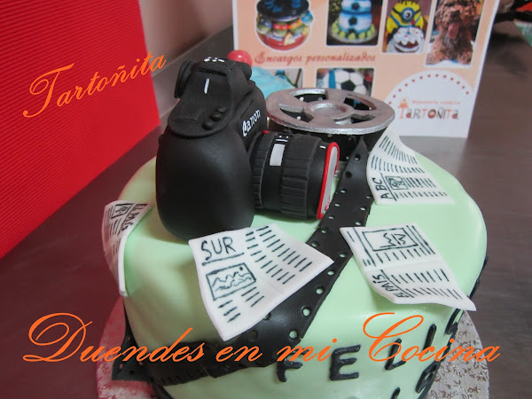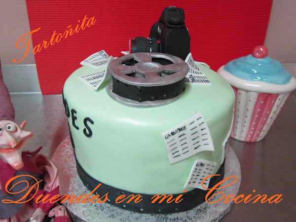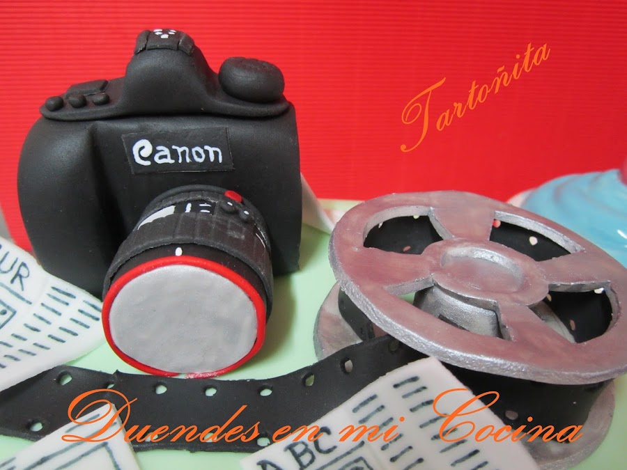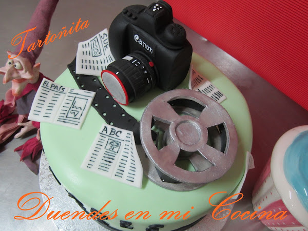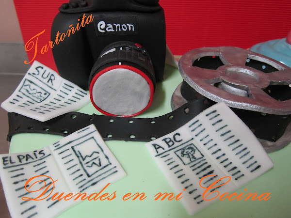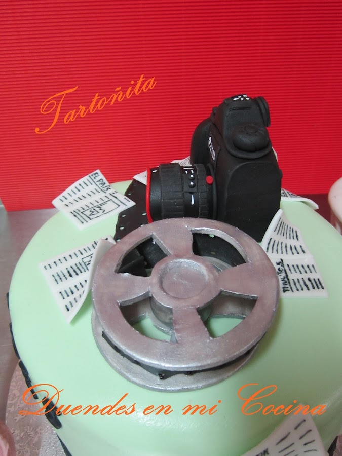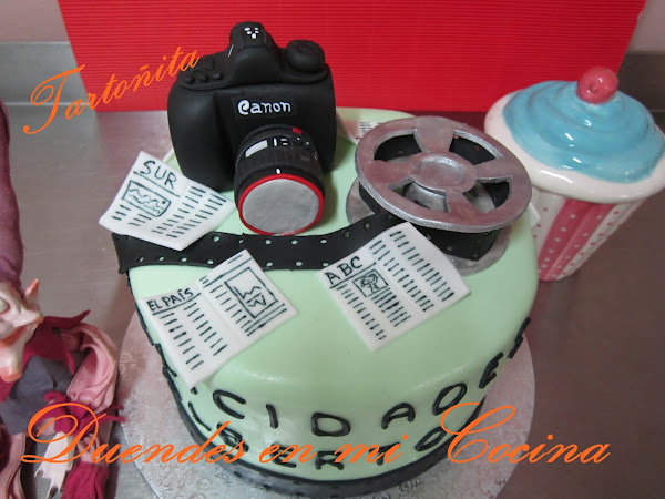 Tarta Audiovisuales, está claro para quién ha sido encargada, no?. Pues sí, una mamá con todo su cariño para su hijo que estudia audiovisuales y hay de todo, cámara de fotos, prensa y rollo de película, espero que os guste.