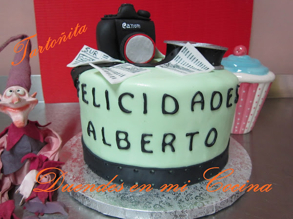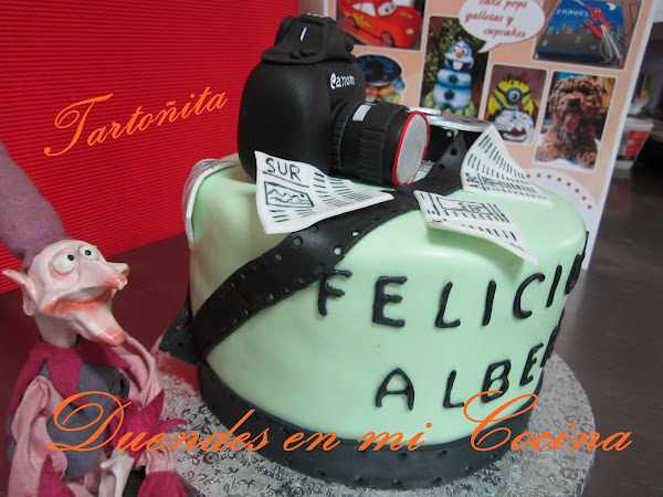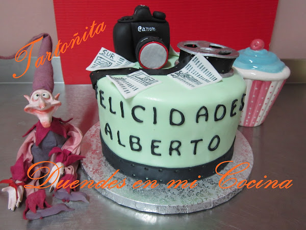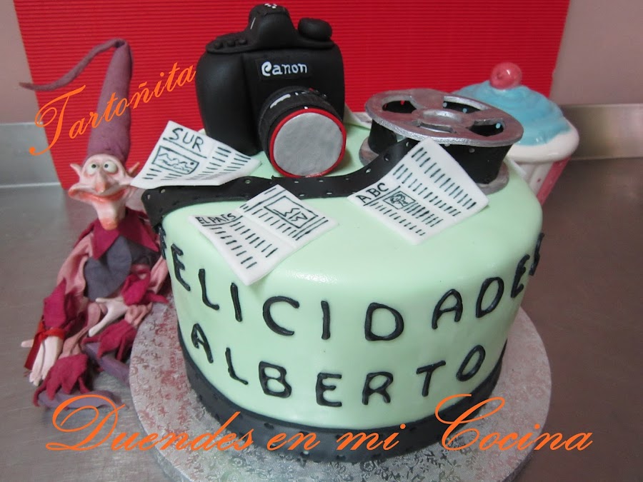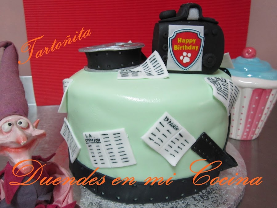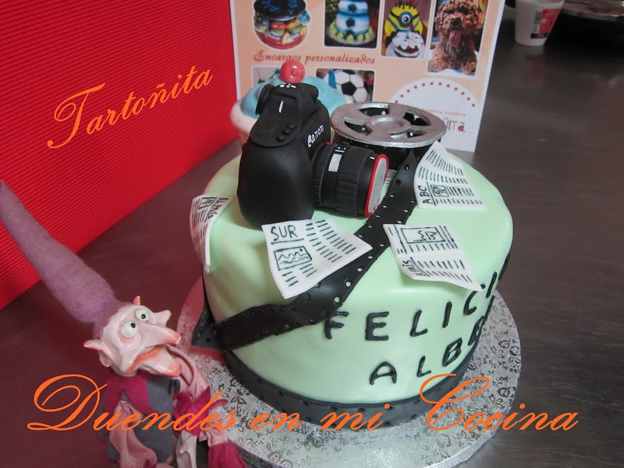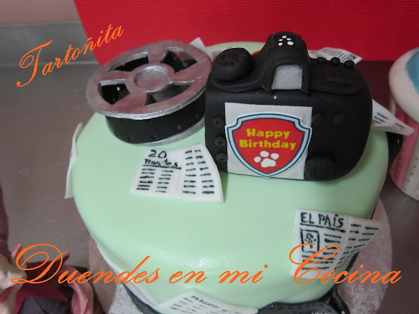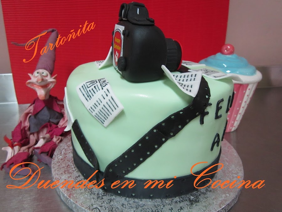 Tarta Audiovisuales, está claro para quién ha sido encargada, no?. Pues sí, una mamá con todo su cariño para su hijo que estudia audiovisuales y hay de todo, cámara de fotos, prensa y rollo de película, espero que os guste.