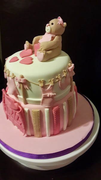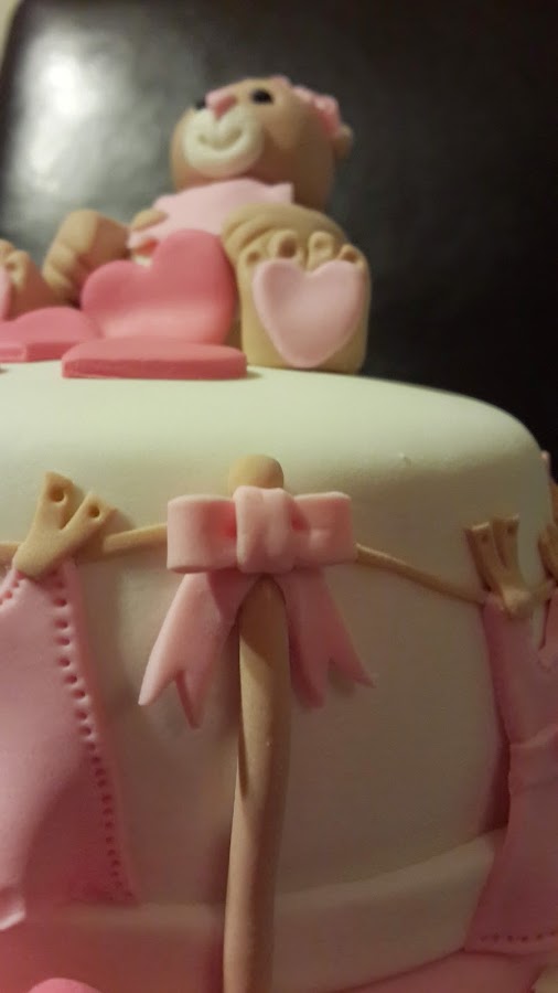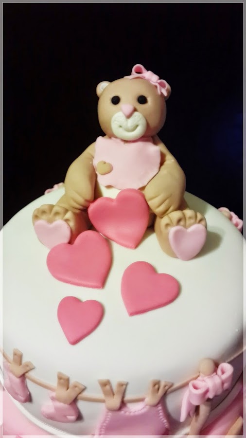 Es para un bebe, que no puede faltar!! un osito, bueno mejor osita que va a ser niña!! y como no, va a venir con muuuucho amor, pues eso es lo que pusimos arriba de la tarta. Queríamos reflejar lo tierno que es esta época que esta pasando.