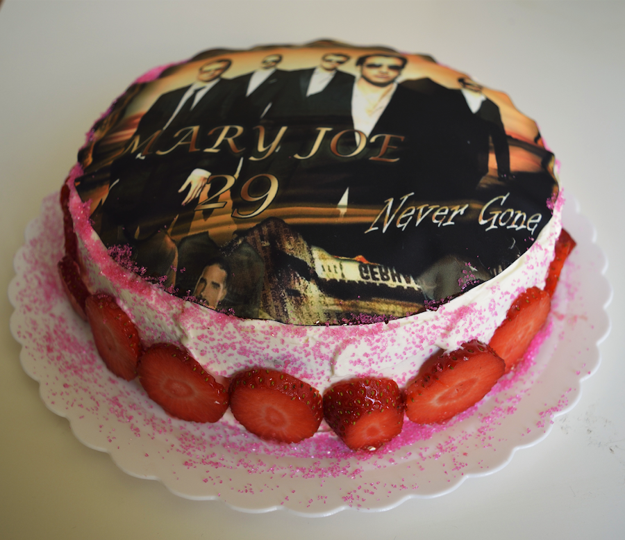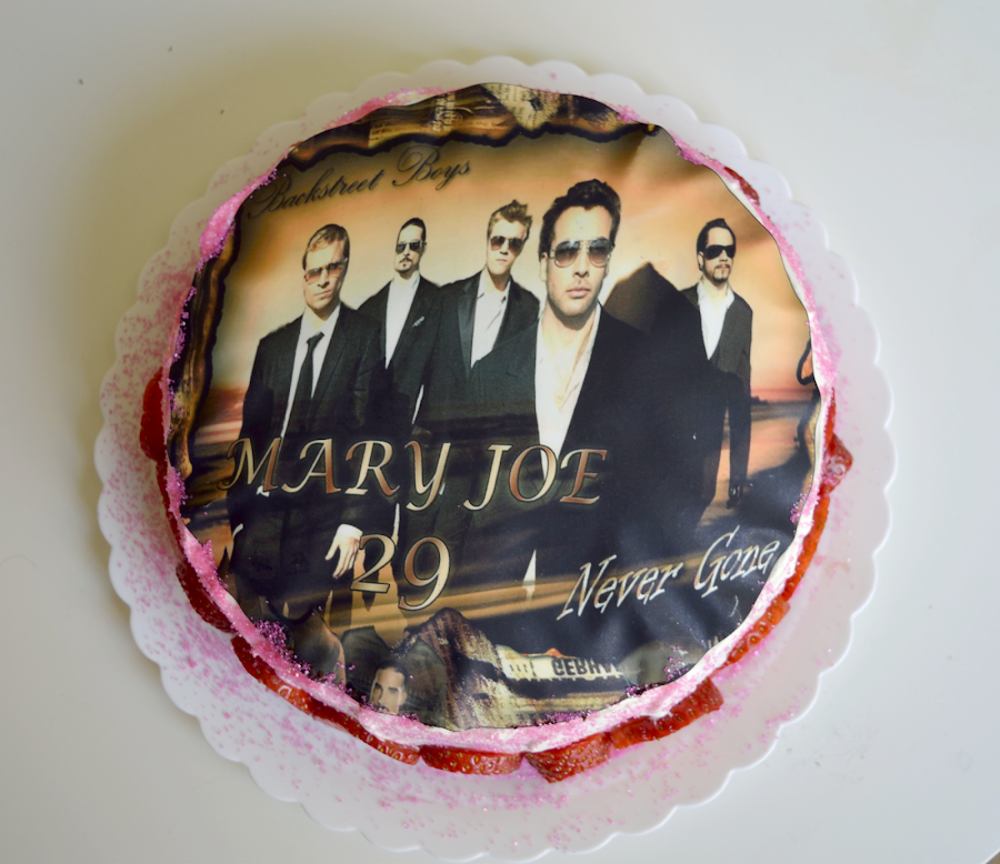 Quería darle una sorpresilla y prepararla una tarta especial, es súper fan de los Backstreet Boys, así que se me ocurrió que podía hacerle una tarta con una foto de sus ídolos, yo estaba tan contenta porque pensaba que la iba a sorprender, y la sorpresa me la lleve yo, que fui a preguntarla que quería de regalo de cumpleaños y me dijo que una tarta de los Backstreet Boys, ja ja ja perpleja me quede, y la dije? bueno eso te lo iba a regalar igualmente y era sorpresa? pero bueno va a ser que me la has fastidiado ja ja ja