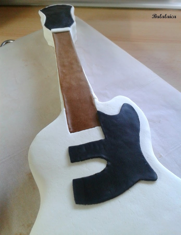 Horneé bizcocho de vainilla y con la ayuda de una "foto-plantilla" lo dí forma de bajo eléctrico, marca ESP.
