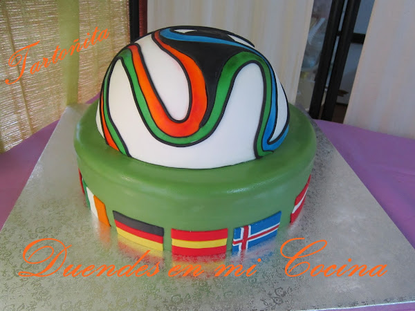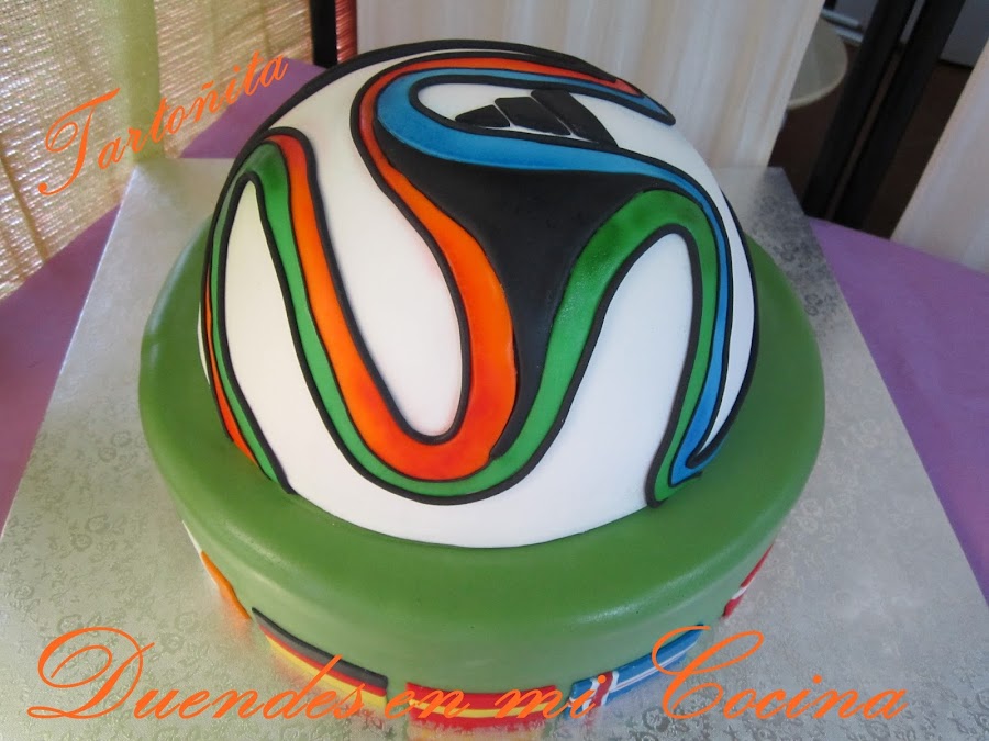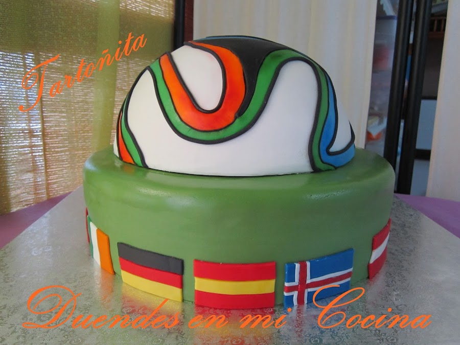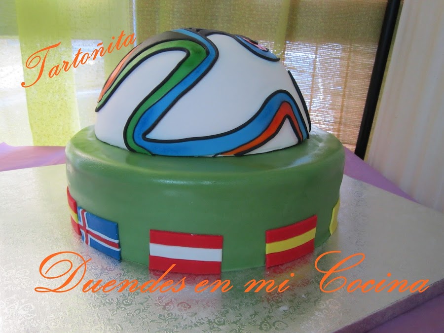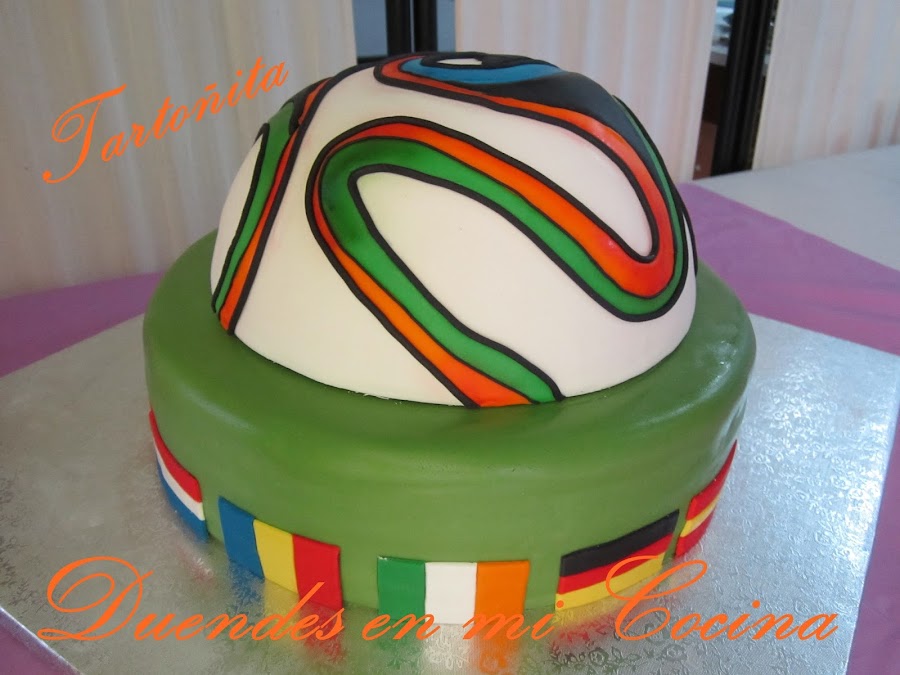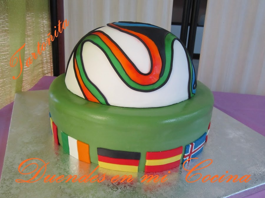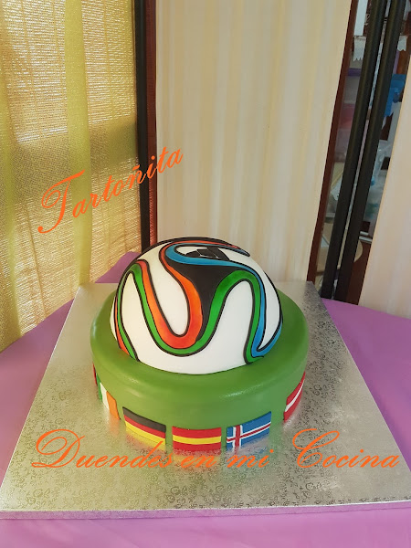 Y con esto acabo la mesa dulce. En las mesas dulces que salen por la tele, ponen todo a la vez, desde los cupcakes hasta la tarta, pero a mi me hacia más gracia sacar la tarta después de todo lo demás, que para algo me la había currado tanto!. Fue todo un reto. La segunda tarta con fondant y no se me ocurre otra cosa mejor que hacer un balón. Pero es que tenía que intentar algo complicado, porque ...