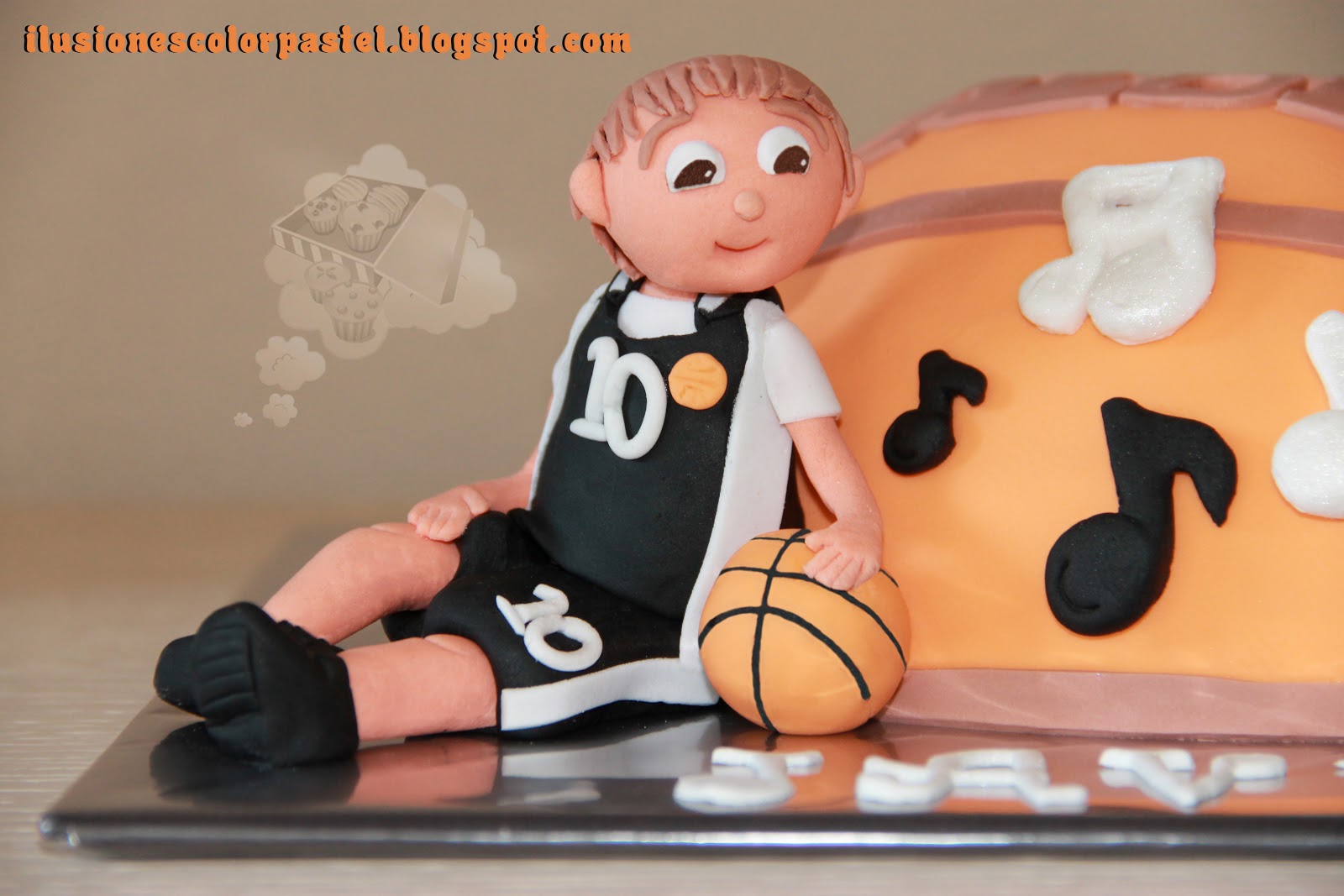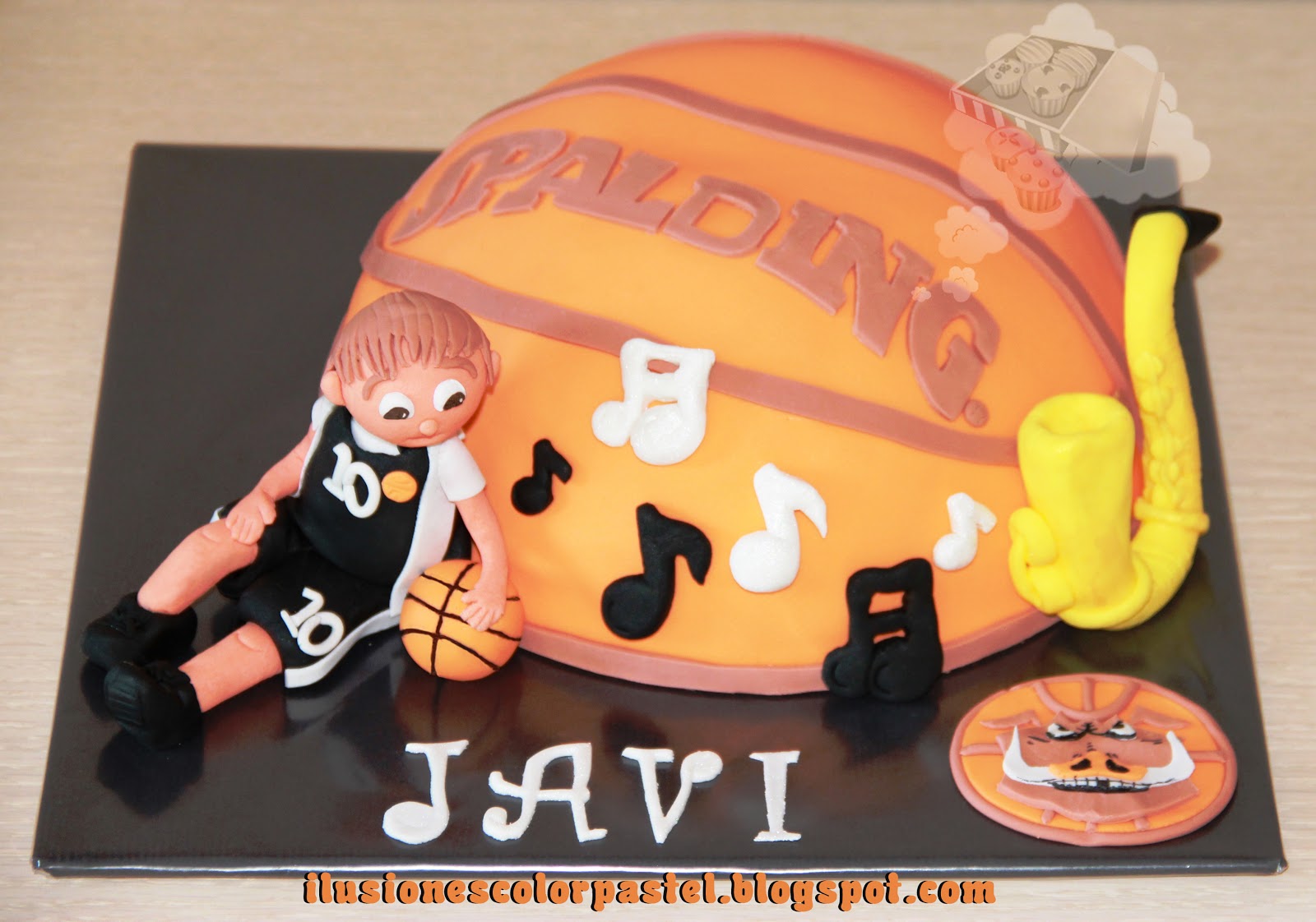 Me mandaron una foto de Javi con la equipación de su equipo para que pudiese reflejarle en la tarta, querían que también saliese el escudo del equipo y su saxofón.
