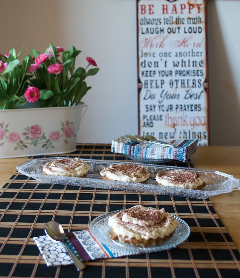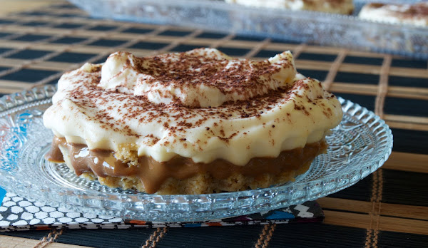 7. Vamos a montar nuestro postre: cuando nuestros moldes y bases han adquirido temperatura ambiente agregamos unas 2 cucharadas de dulce de leche y esparcimos sobre nuestra base de galletas. Sobre el dulce de leche colocamos nuestras rebanadas de plátano y finalmente colocamos unas dos cucharadas de nata montada (crema de leche). Si lo deseas puedes esparcir cacao en polvo sobre la nata (crema de leche) para decorar. Mira el set de fotos que te he preparado:
