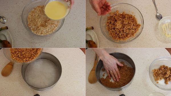 Trituramos las galletas con una picadora . Le añadimos la mantequilla derretida y mezclamos hasta que se forme una masa arenosa y homogénea.