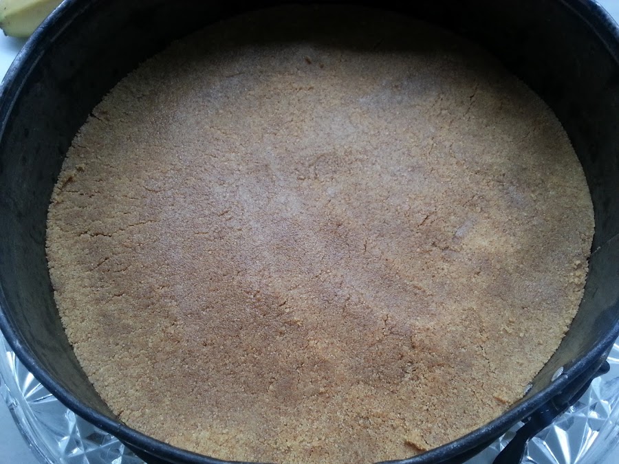 3. - Se la añadimos a las galletas y removemos, esta mezcla es la base de la tarta. La echamos en el molde y la repartimos aplastando bien con una cuchara.