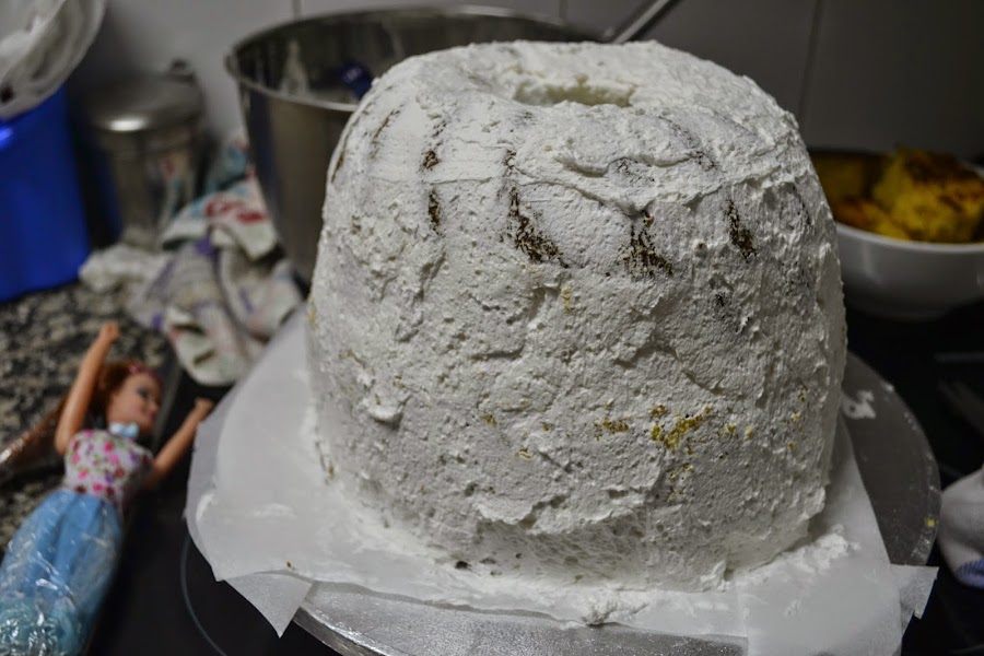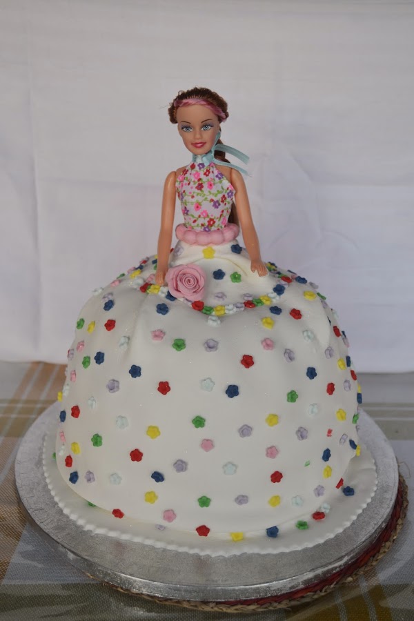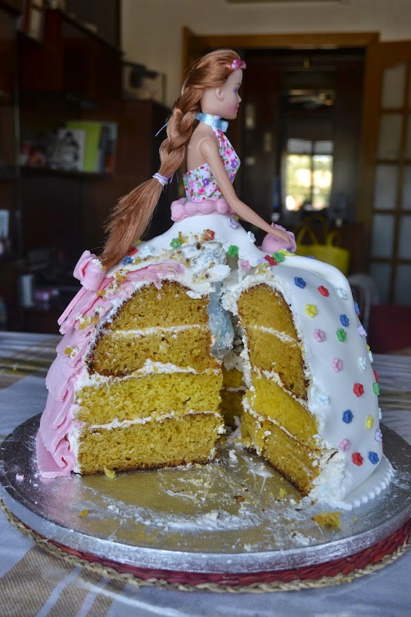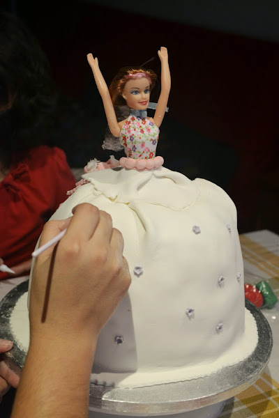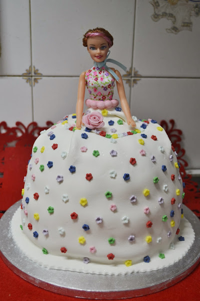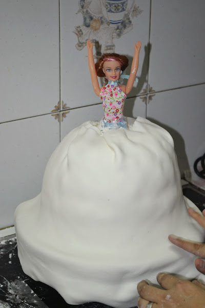 Si te fijas yo he envuelto la parte de abajo de la Barbie con film transparente para que al introducirla en la tarta no se manche.