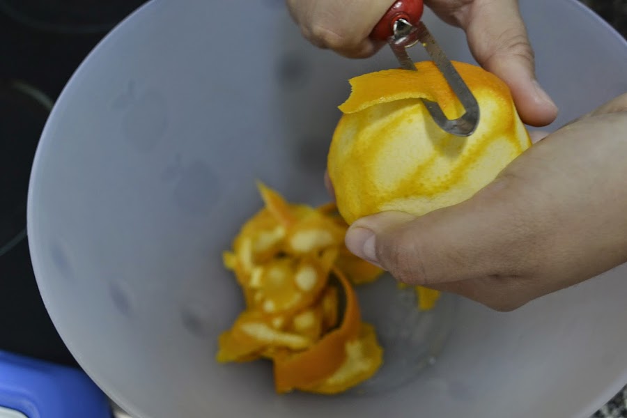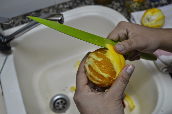 Pela las naranjas sin la parte blanca y saca los gajos limpios de semillas y venas.
