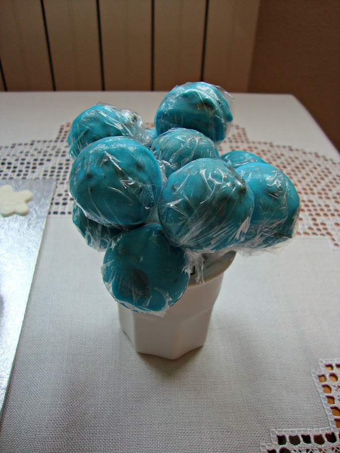 Los cake pops son de genovesa de chocolate blanco con ganache de chocolate negro y cobertura de caramelo en color azul.