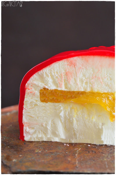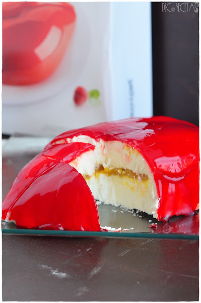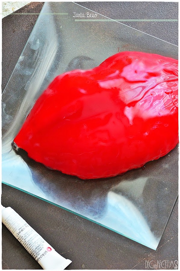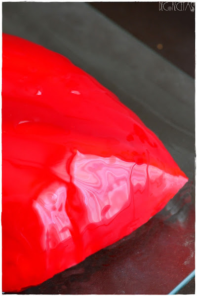 Como la cobertura espejo ya la tengo lista simplemente calentamos en el microondas añadiendo colorante rojo al gusto y removemos para que el color quede homogéneo. Desmoldamos la tarta poniéndola encima de un vaso que estará dentro de una fuente para poder glasear por encima con nuestra cobertura espejo.