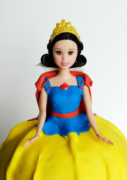 Los bizcochos una vez montados, llevan un agujero en el centro donde va metida la muñeca. El resto de la decoración y todo el traje y la capa son de fondant, salvo la corona que ya llevaba la muñeca.